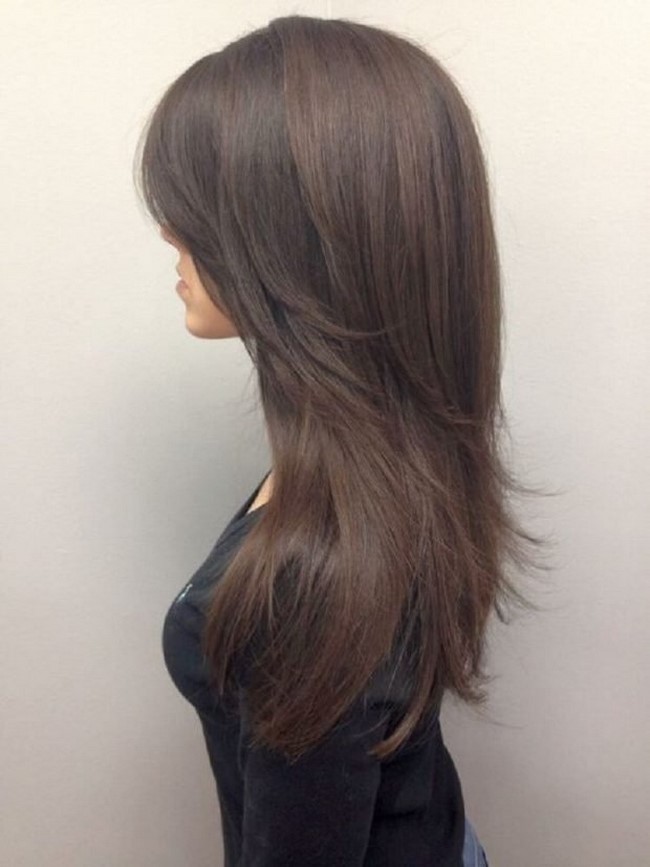 Прекрасно і стильно виглядають довгі стрижки з подовженою чілкою на дві сторони, як з рівним зрізом решти, так і з багатошаровістю і навіть рваним ефектом.