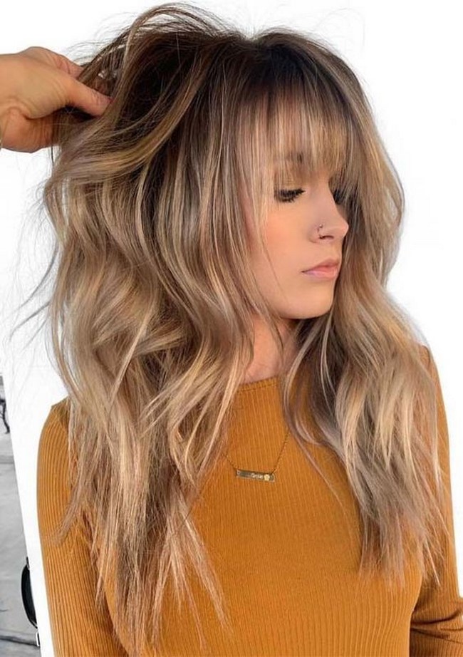 - Густа чілка нижче брів як доповнення стрижки на довге волосся