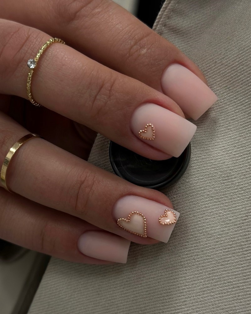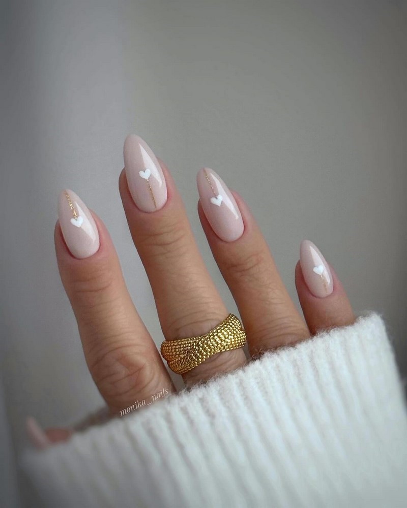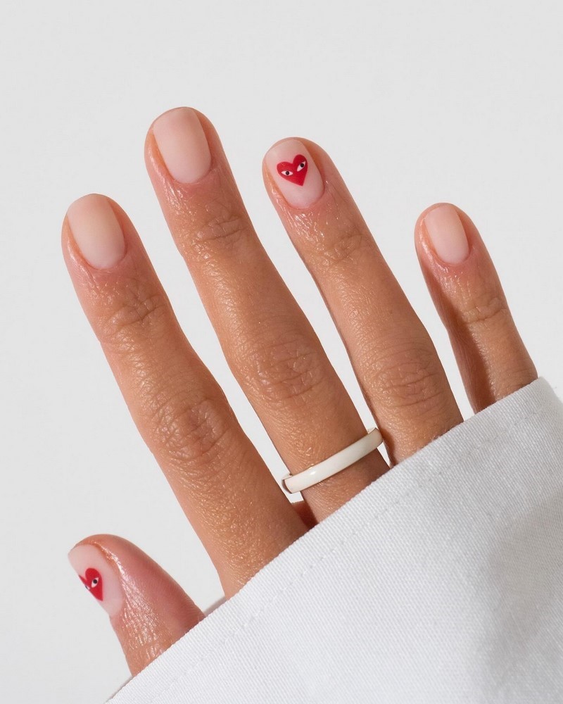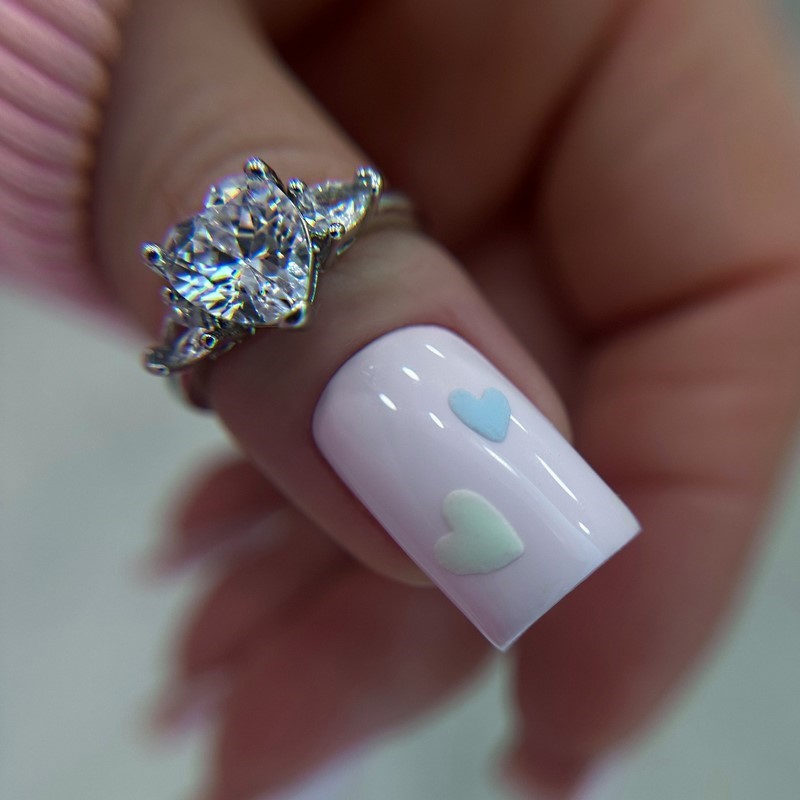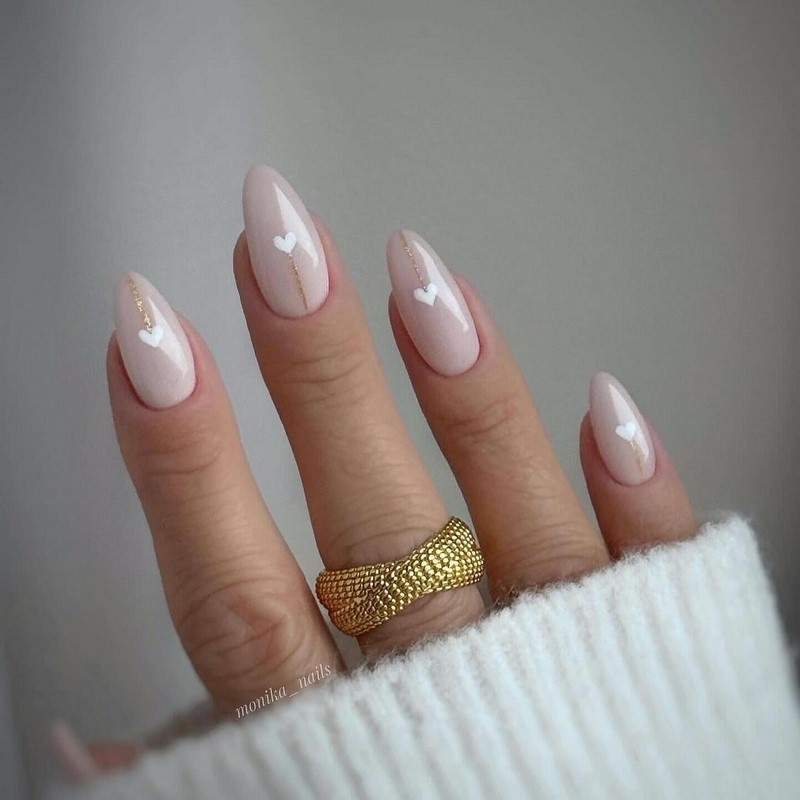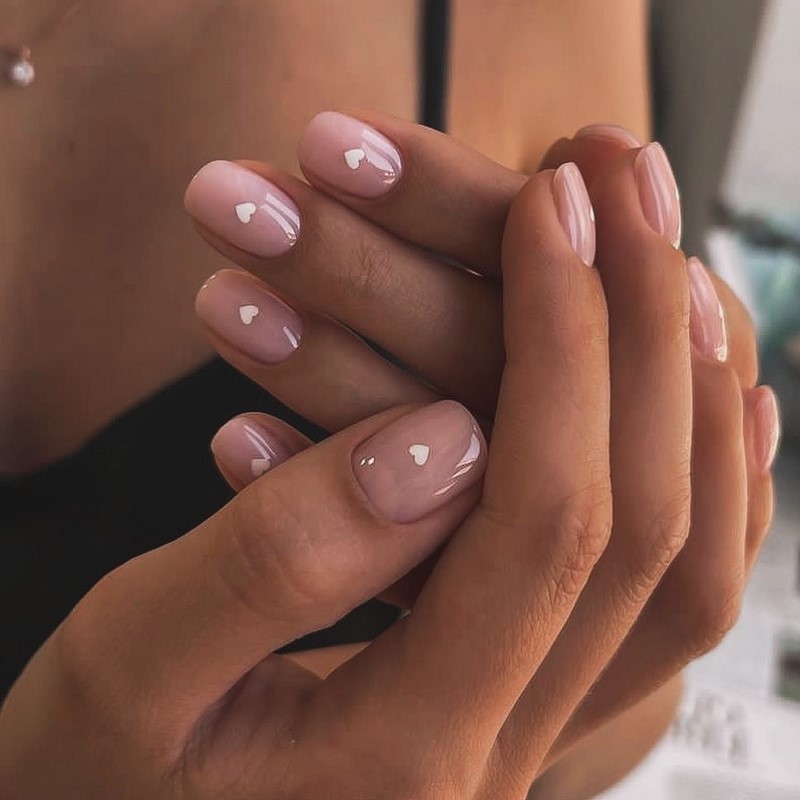 Тренд на мінімалізм залишається актуальним. Невеликі сердечка, нанесені тонкими лініями або у вигляді маленьких акцентів на одному-двох нігтях, чудово підходять для повсякденного стилю. Для такого дизайну з сердечками використовують нейтральні відтінки лаку: бежевий, білий, ніжно-рожевий чи прозорий базовий тон.