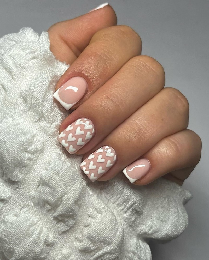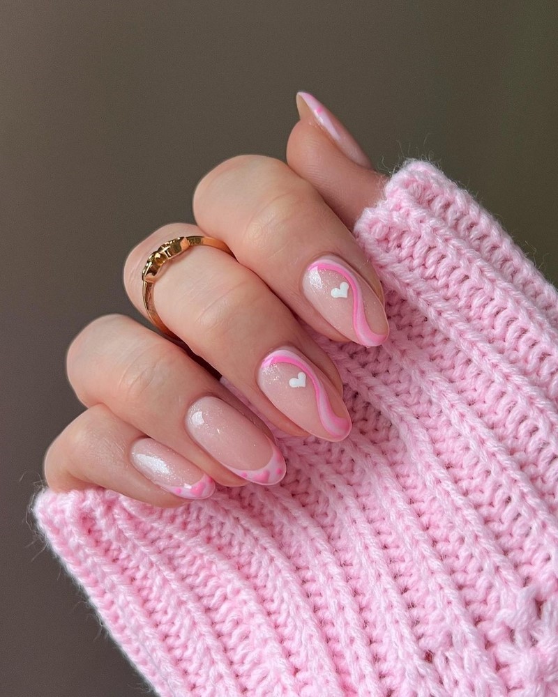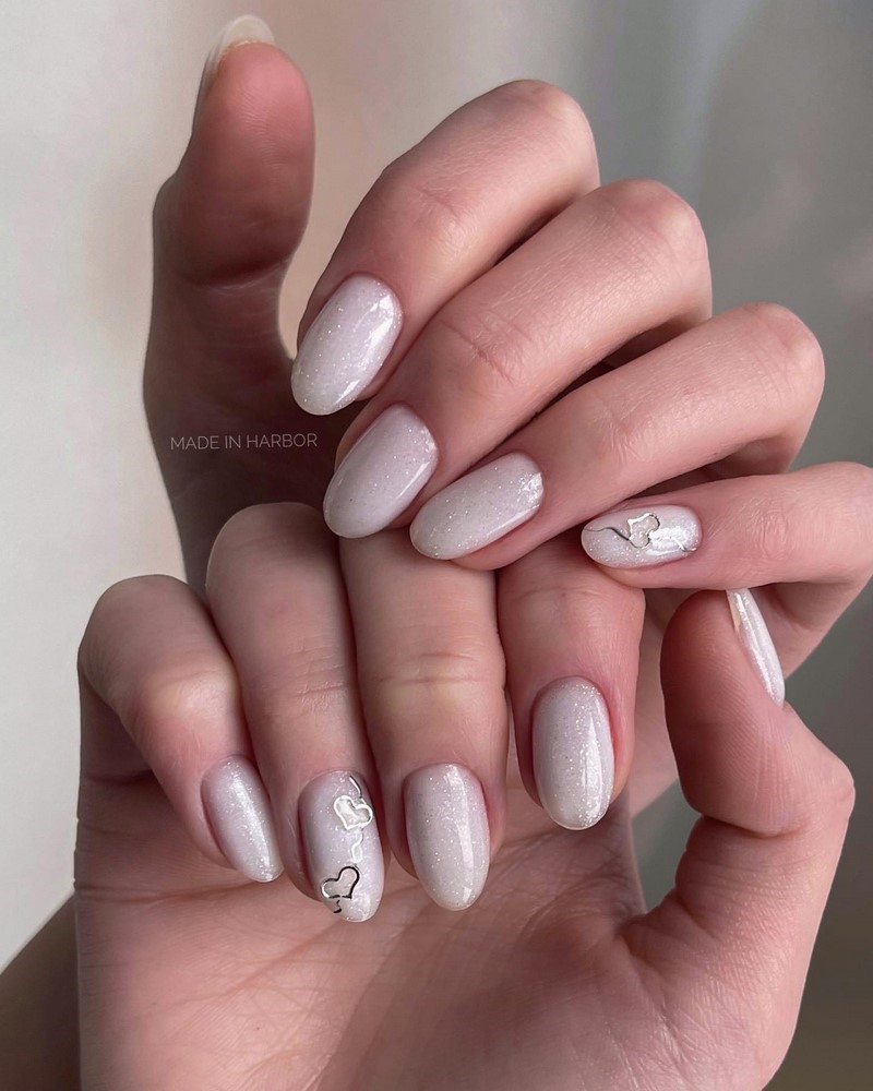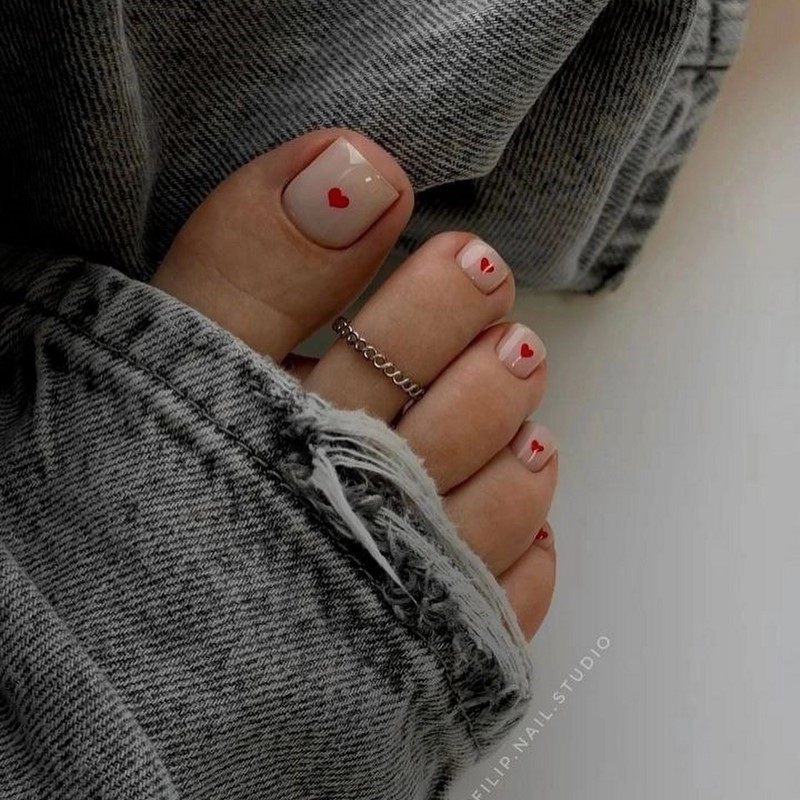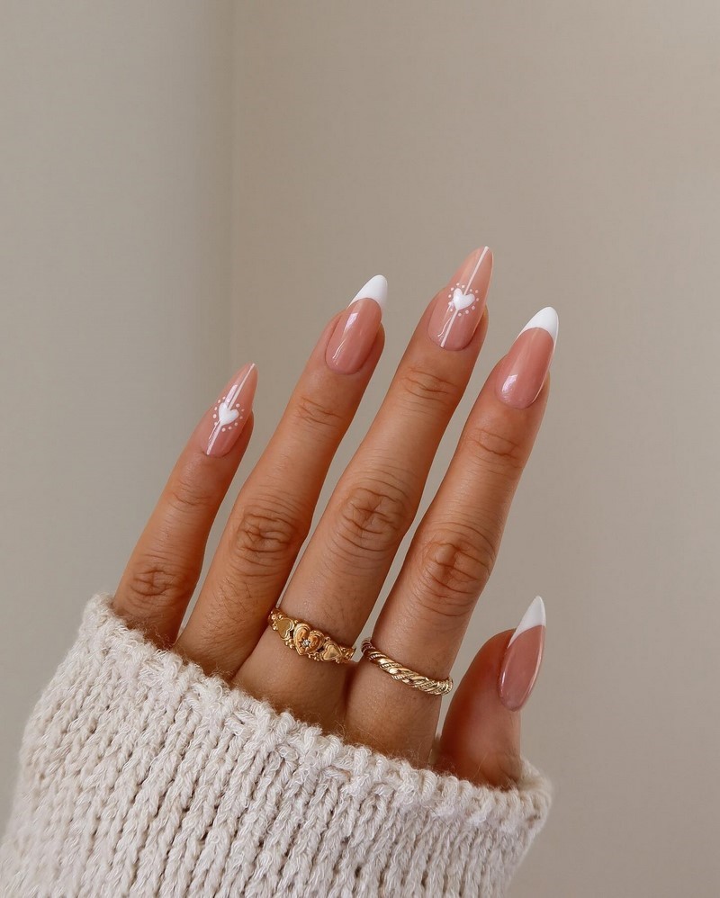 Тренд на мінімалізм залишається актуальним. Невеликі сердечка, нанесені тонкими лініями або у вигляді маленьких акцентів на одному-двох нігтях, чудово підходять для повсякденного стилю. Для такого дизайну з сердечками використовують нейтральні відтінки лаку: бежевий, білий, ніжно-рожевий чи прозорий базовий тон.