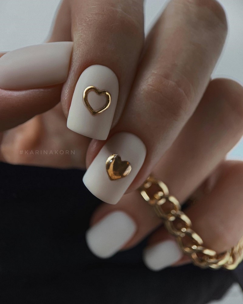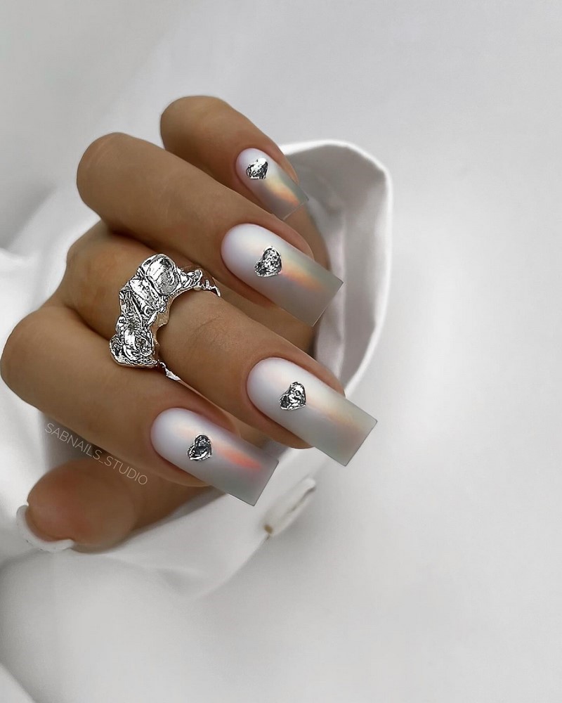 Металеві відтінки — золото, срібло або хром — чудово виглядають у поєднанні з сердечками. Наприклад, сердечка можуть бути виконані за допомогою фольги, стемпінгу або металевих наклейок. Цей варіант додає сердечному манікюру розкішного вигляду.