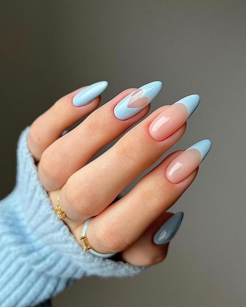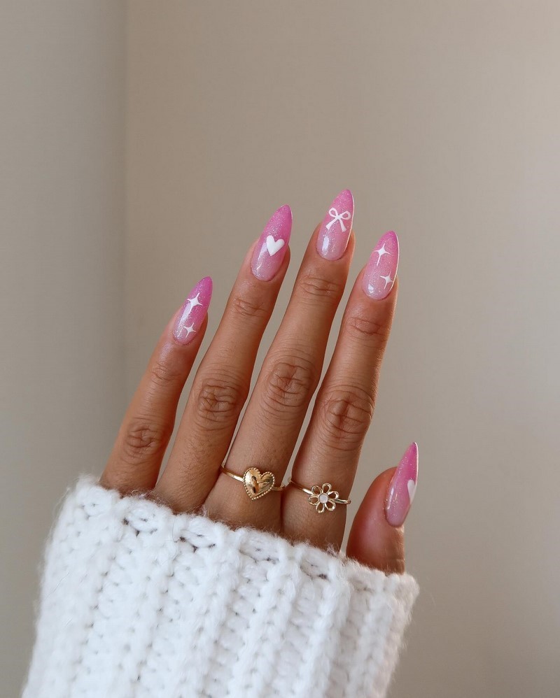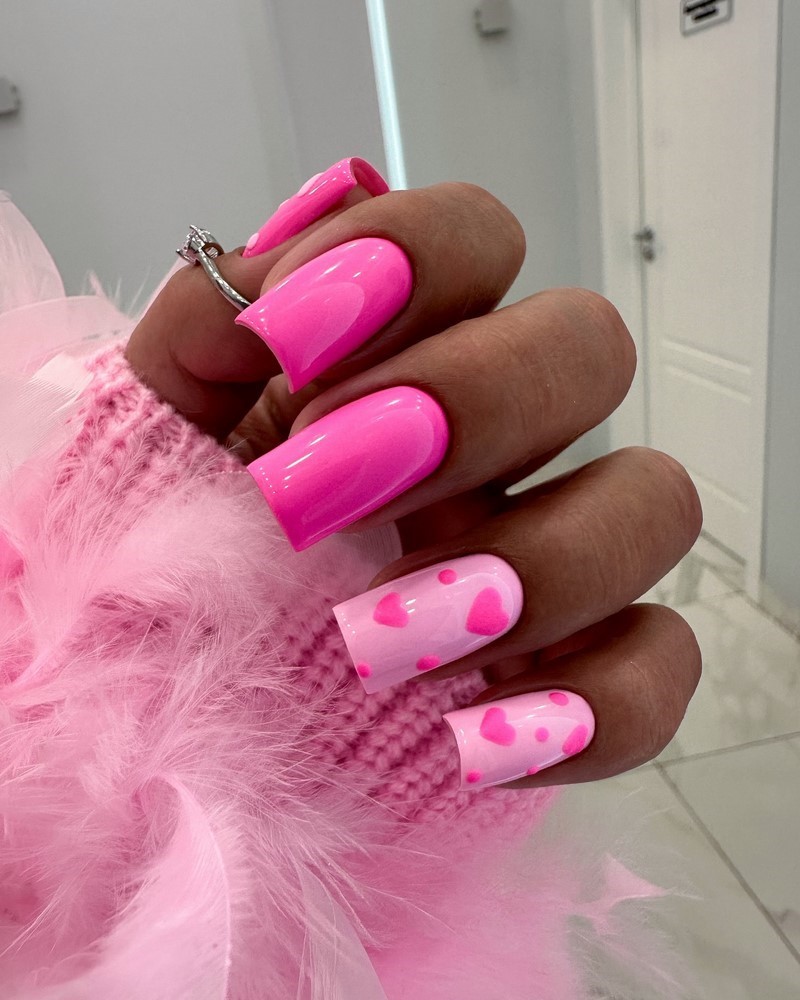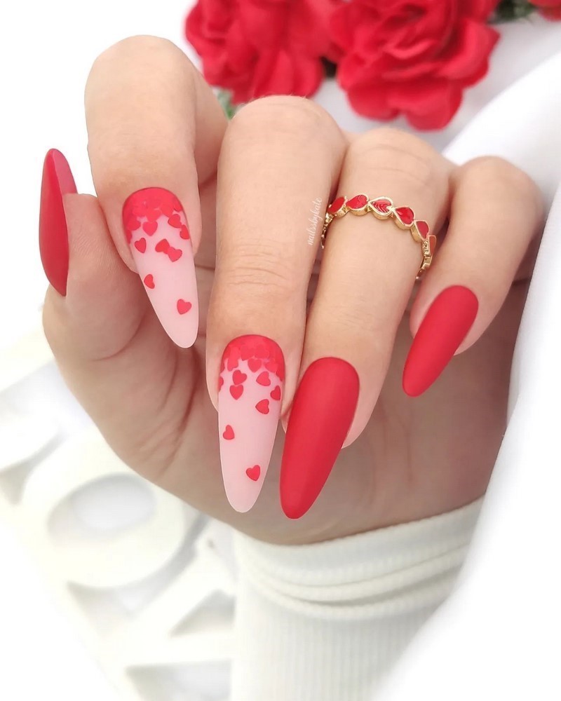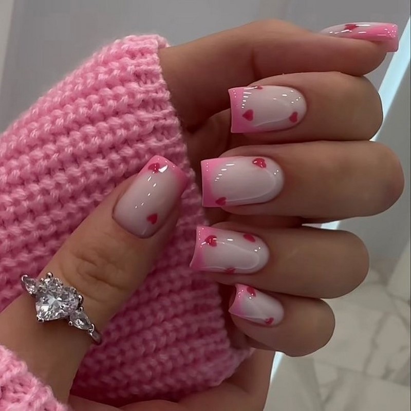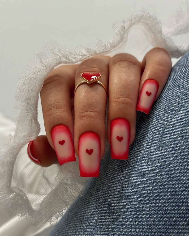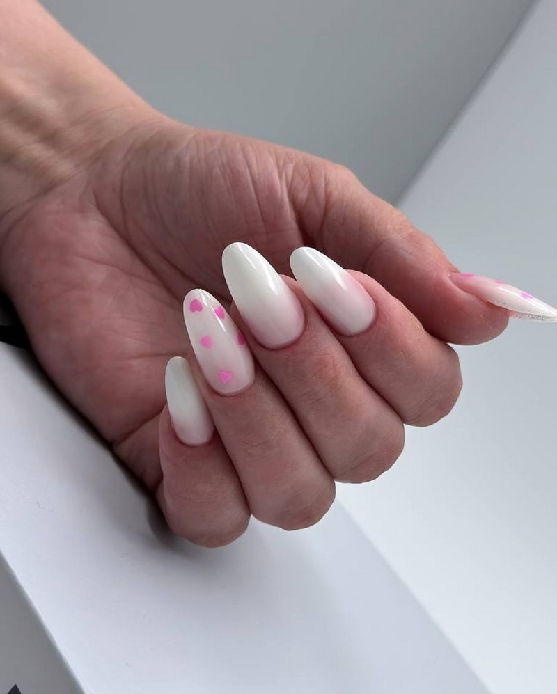 Омбре-дизайн із плавним переходом кольорів виглядає ніжно та елегантно в будь-якому варіанті манікюру. Сердечка можуть бути розташовані на межі переходу або виконані у вигляді градієнта — від більш насиченого кольору до прозорого.