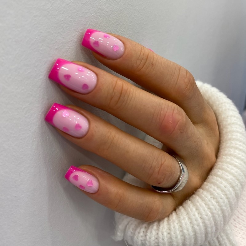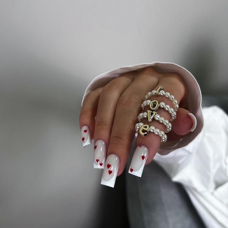 Французький манікюр з новим акцентом — сердечками замість традиційної смужки. Такий дизайн може бути виконаний у класичних кольорах або в яскравих варіантах: червоному, бордовому чи золотому. Френч манікюр з сердечками — це ідеальний вибір для романтичних подій.