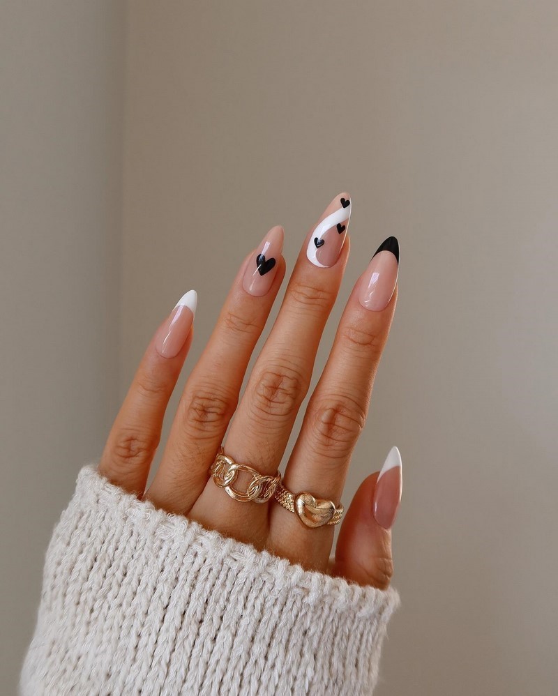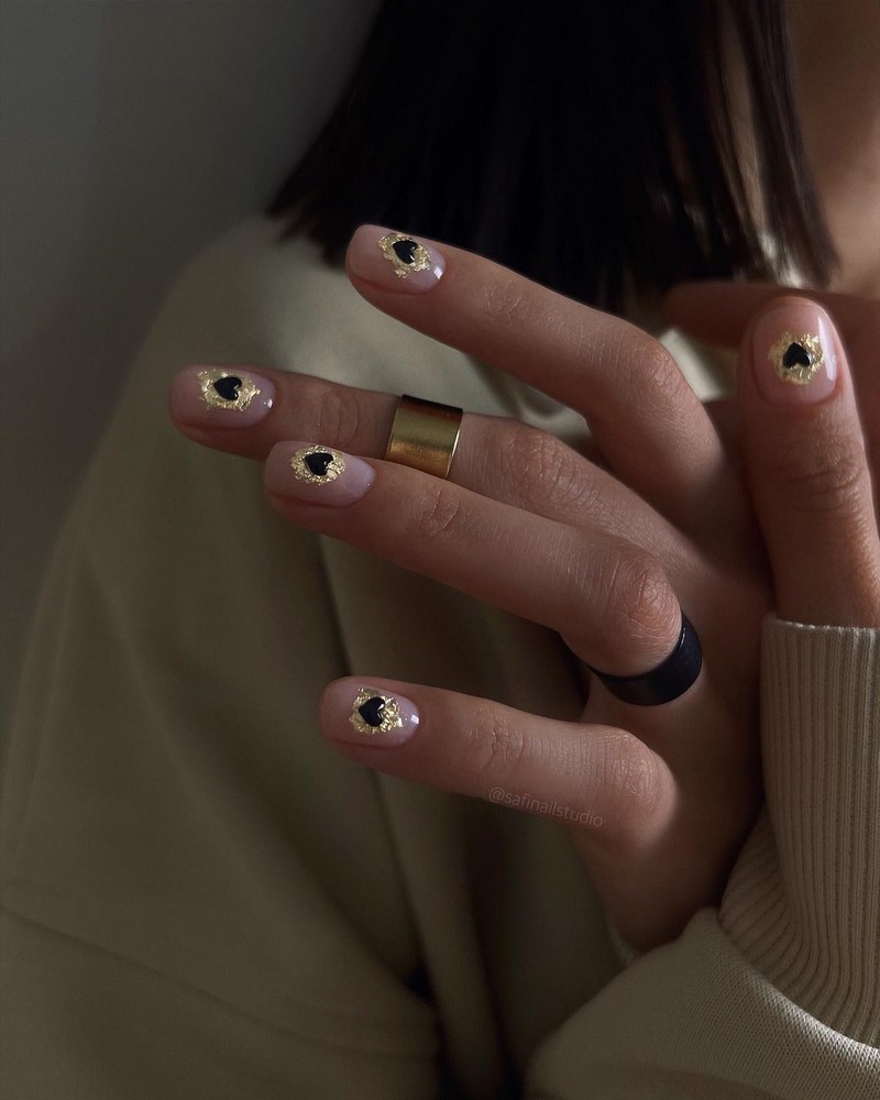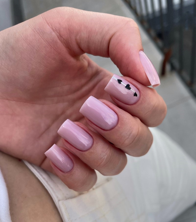 Для тих, хто любить більш стриманий та одночасно стильний вигляд, чорні сердечка на нюдовій основі — ідеальний вибір дизайну 2025. Вони додають манікюру загадковості та контрасту.