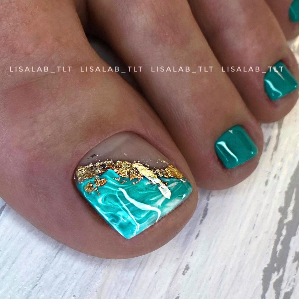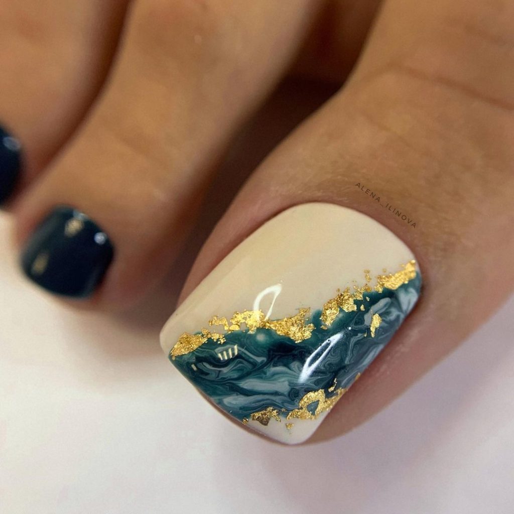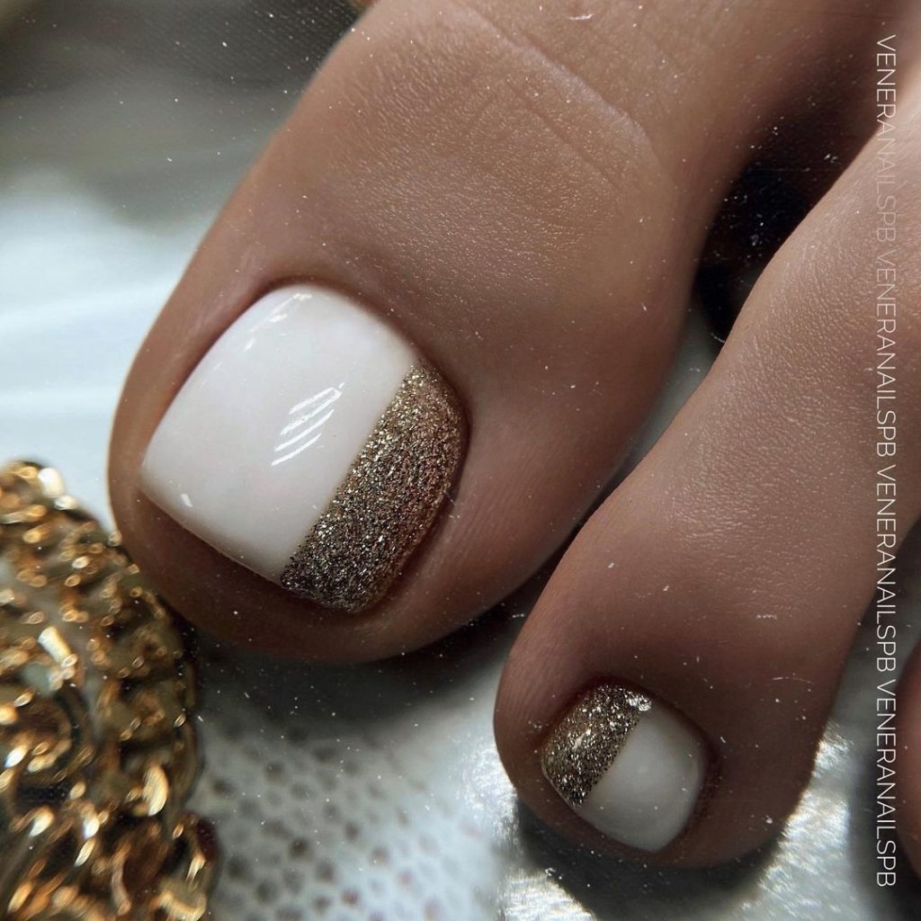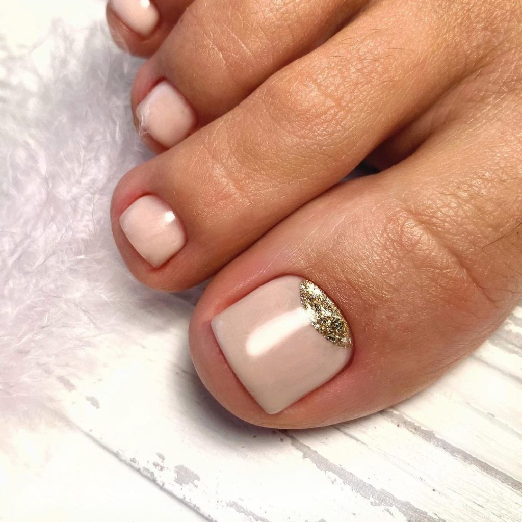 Не втрачаючи актуальності, золотисті акценти завжди знайдуть цікаве поєднання в дизайні модного педикюру. Золоті блискітки або смужки, шматочки фольги або золота втирка стануть доречними в багатьох варіантах дизайну педикюру. Головне не переборщити з золотистим декором, вибравши щось одне і дотримуватися при цьому акцентного нейл-тренду.