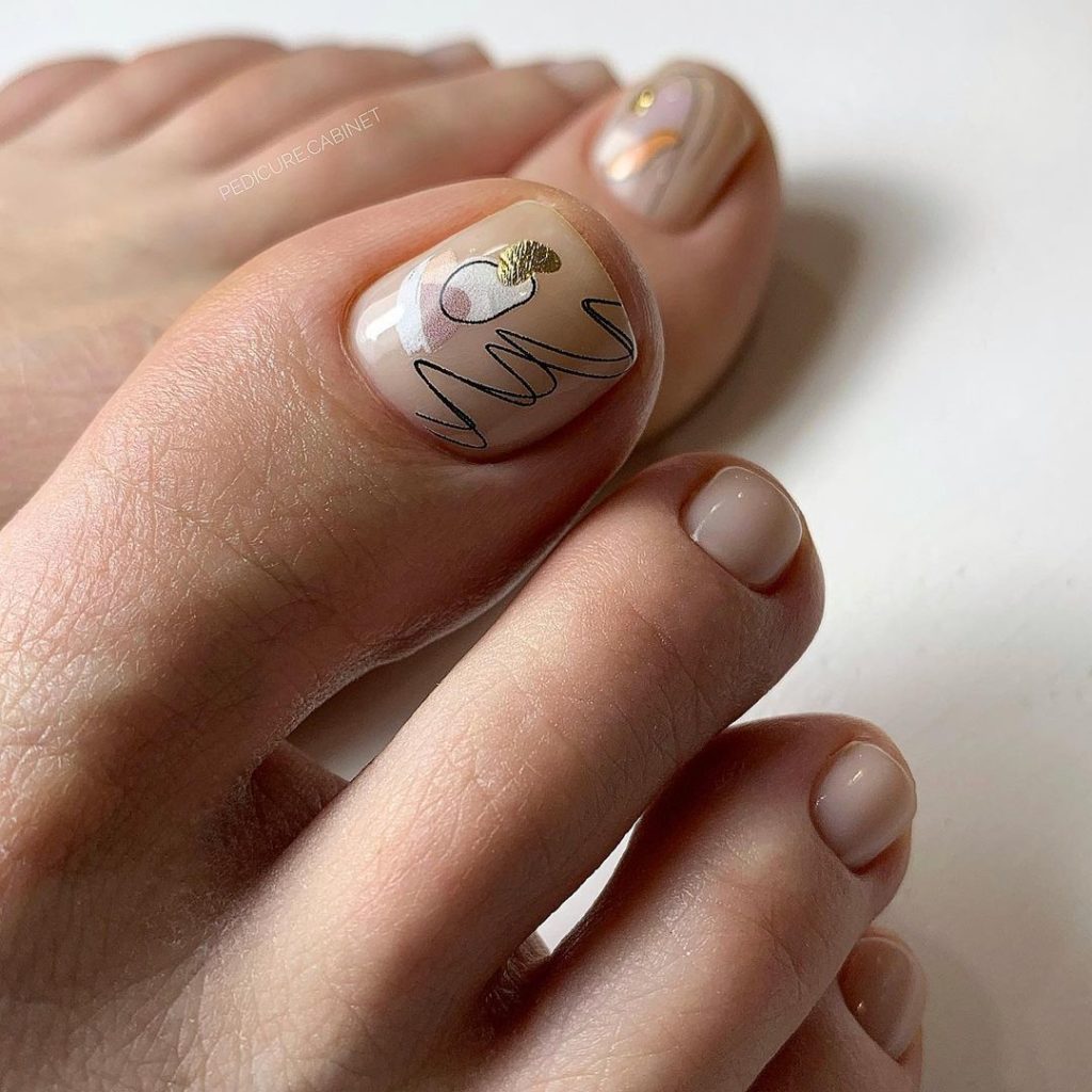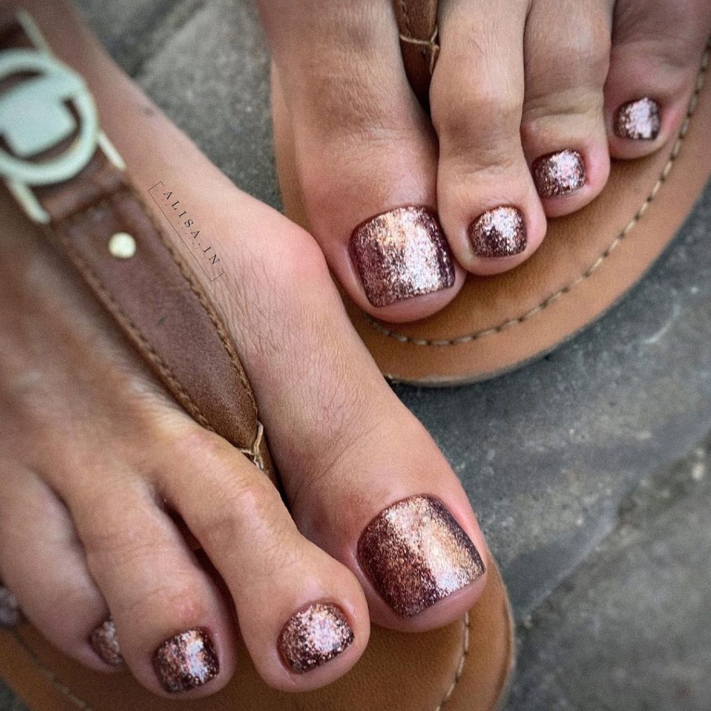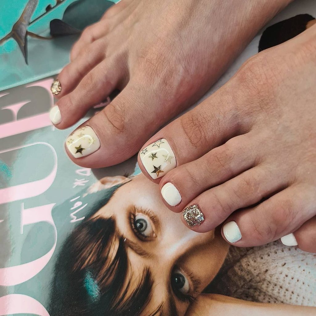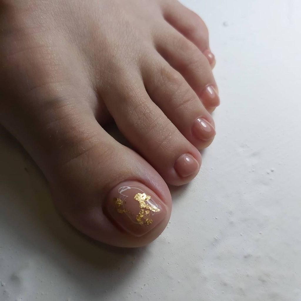 Не втрачаючи актуальності, золотисті акценти завжди знайдуть цікаве поєднання в дизайні модного педикюру. Золоті блискітки або смужки, шматочки фольги або золота втирка стануть доречними в багатьох варіантах дизайну педикюру. Головне не переборщити з золотистим декором, вибравши щось одне і дотримуватися при цьому акцентного нейл-тренду.