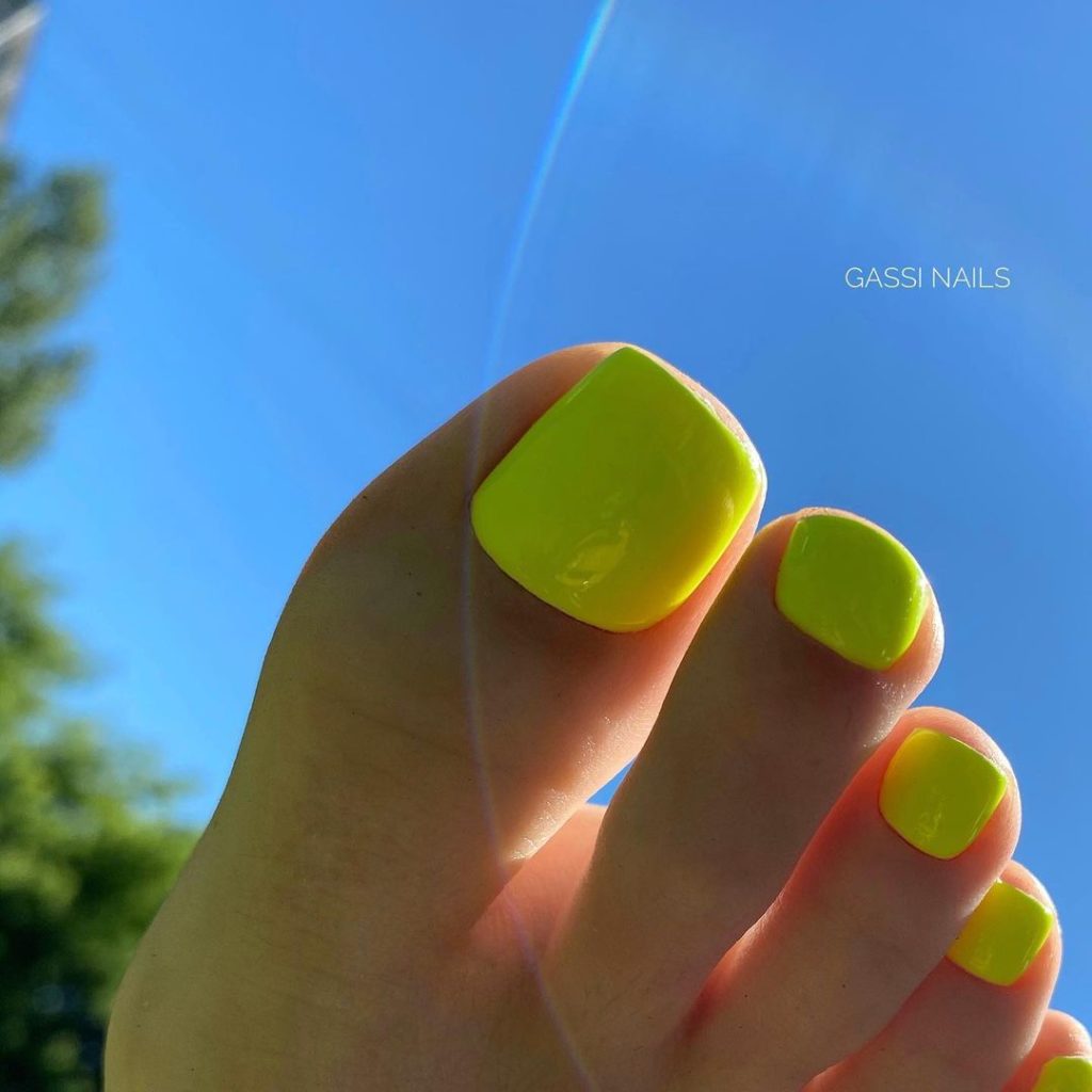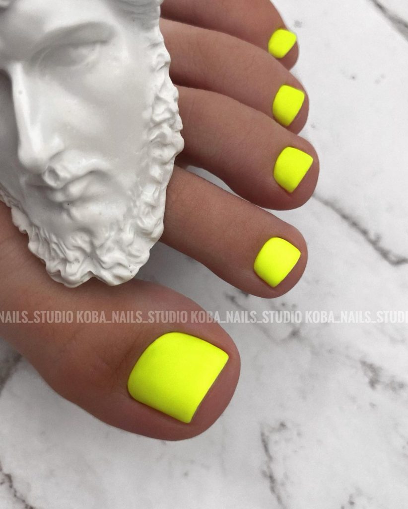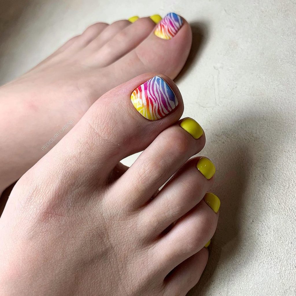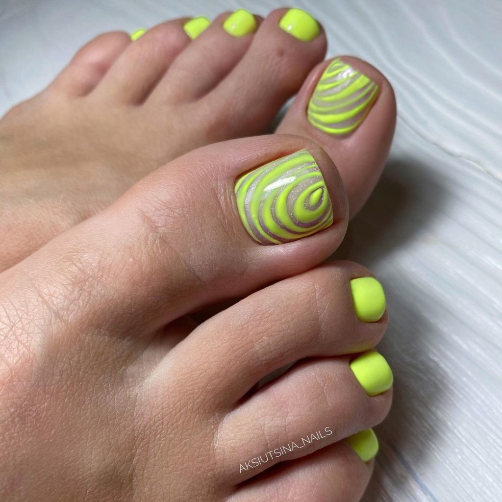 Однотонні чи різнокольорові ідеї яскравого дизайну педикюру вибрати для своїх ніжок в новому сезоні? Якщо монохром — то неонові кольори, а якщо ви хочете бачити пальчики різнокольоровими, то краще вибрати пастель. Особливу популярність в педикюрі 2025 отримав кислотний жовтий в лимонному відтінку, який став чудовою базою для яскравих дизайнів з малюнками.
