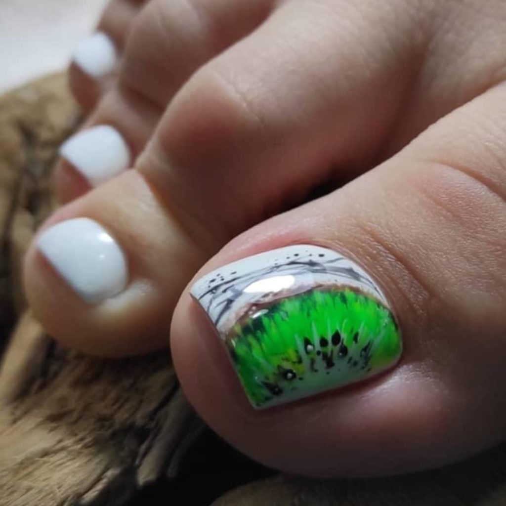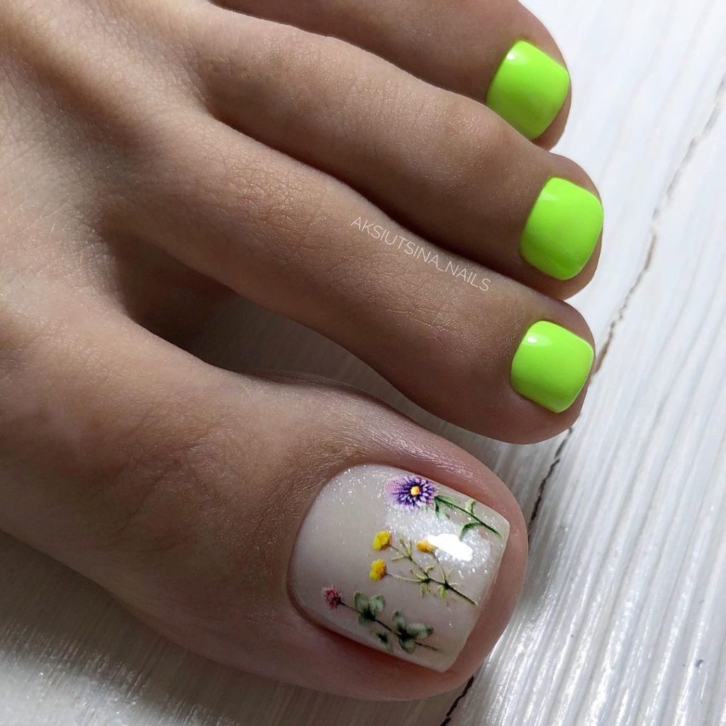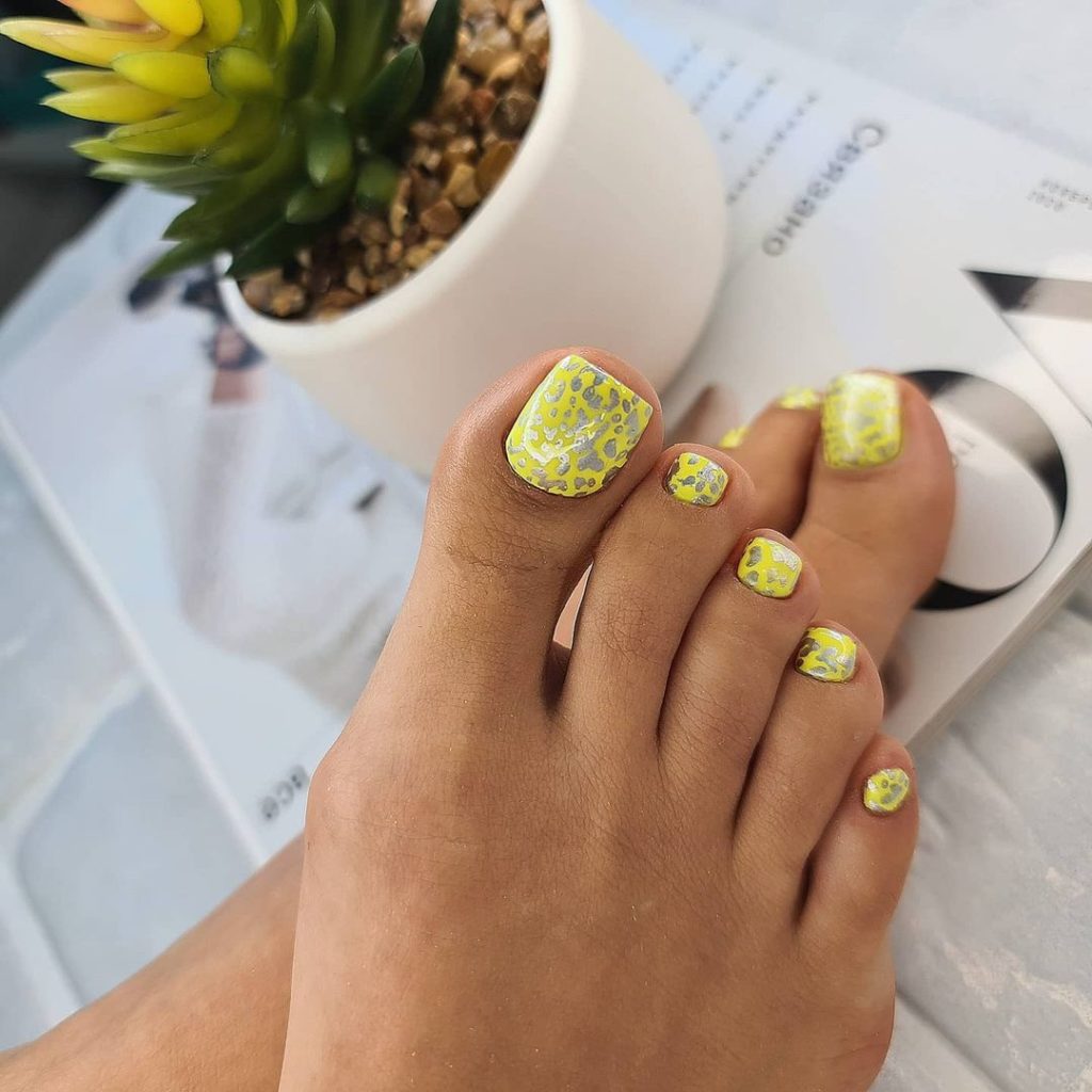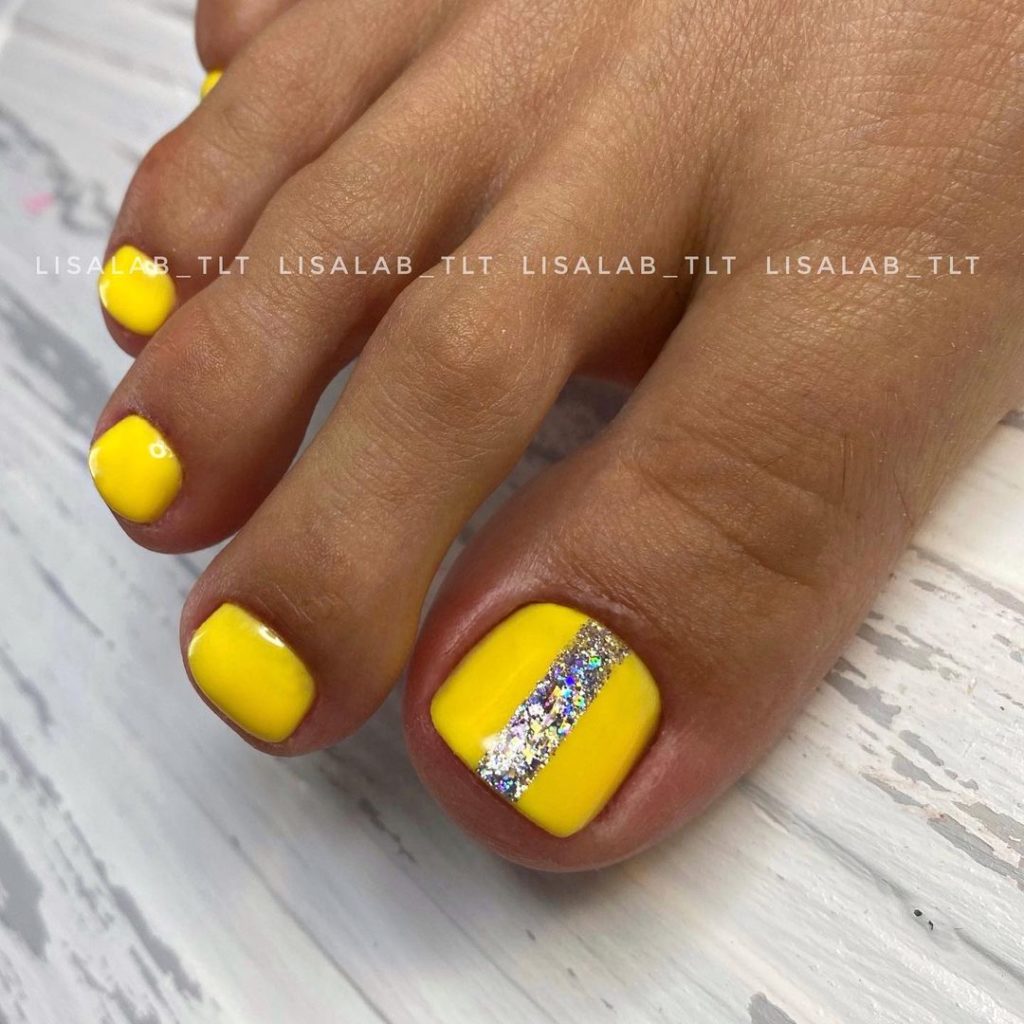 Однотонні чи різнокольорові ідеї яскравого дизайну педикюру вибрати для своїх ніжок в новому сезоні? Якщо монохром — то неонові кольори, а якщо ви хочете бачити пальчики різнокольоровими, то краще вибрати пастель. Особливу популярність в педикюрі 2025 отримав кислотний жовтий в лимонному відтінку, який став чудовою базою для яскравих дизайнів з малюнками.
