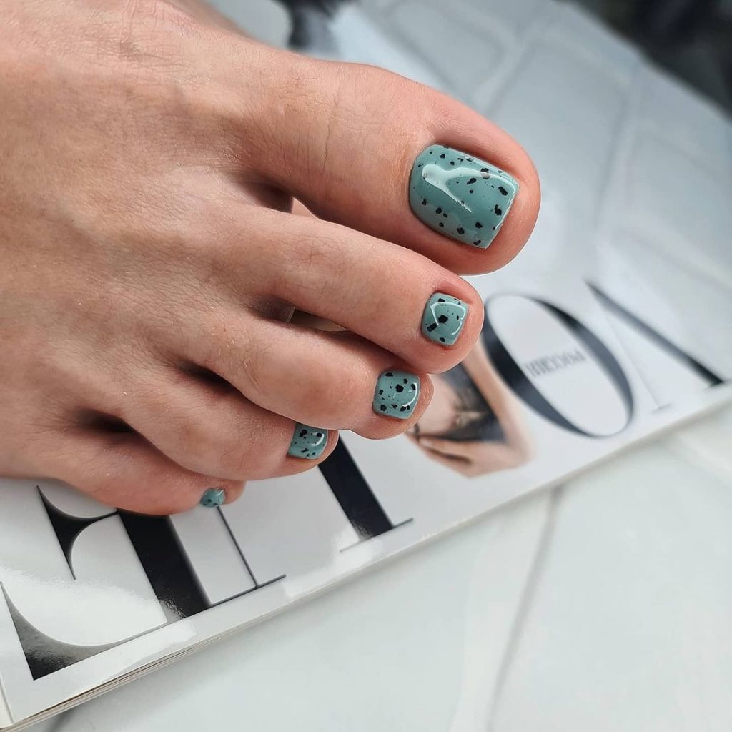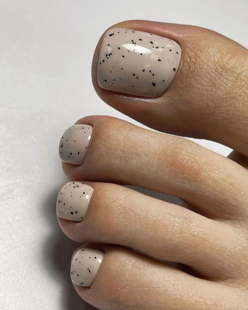 Як тільки не називають цей простий у виконанні, але дуже милий і незвичайний дизайн педикюру з чорними точками. «Перепелине яйце», «бризки фарби», «пластівці», «чорна крихта» — усі назви позначають один і той же дизайн, який буде дуже популярним в цьому сезоні.