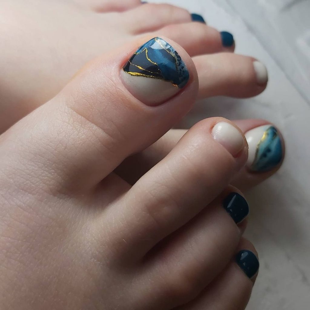 Морський тренд 2025 перенісся з дизайну літнього одягу в дизайн нігтів, в тому числі і в педикюр. Морські мотиви найбільш яскраво втілюються в дизайні з розводами в синіх і блакитних відтінках. Подібний візерунок дійсно нагадує морську хвилю. Морський дизайн педикюру звичайно краще робити в літній сезон.