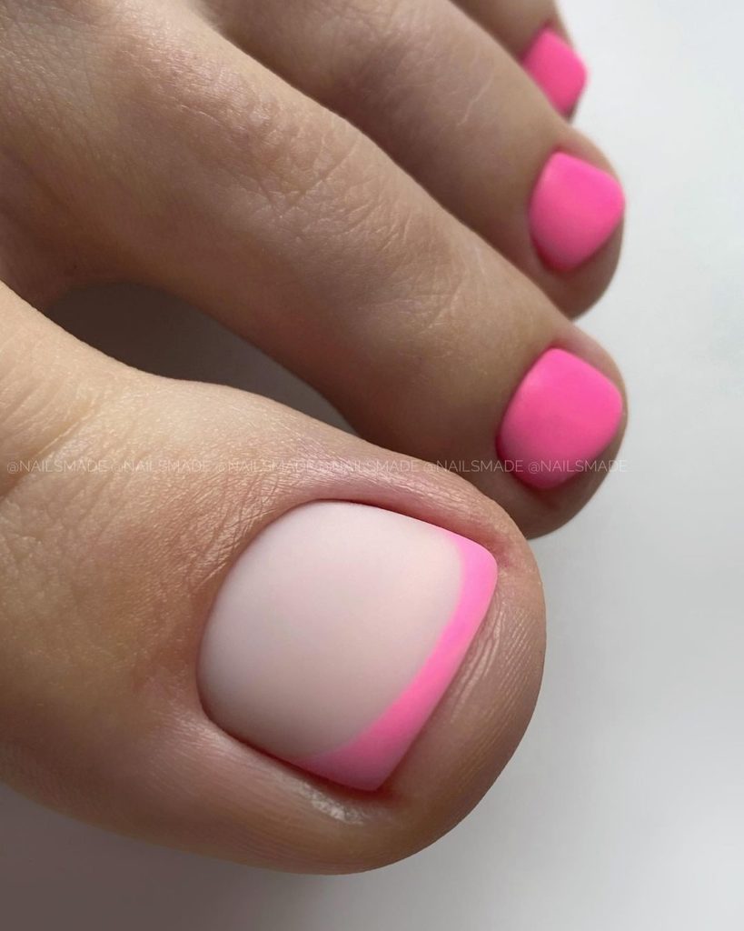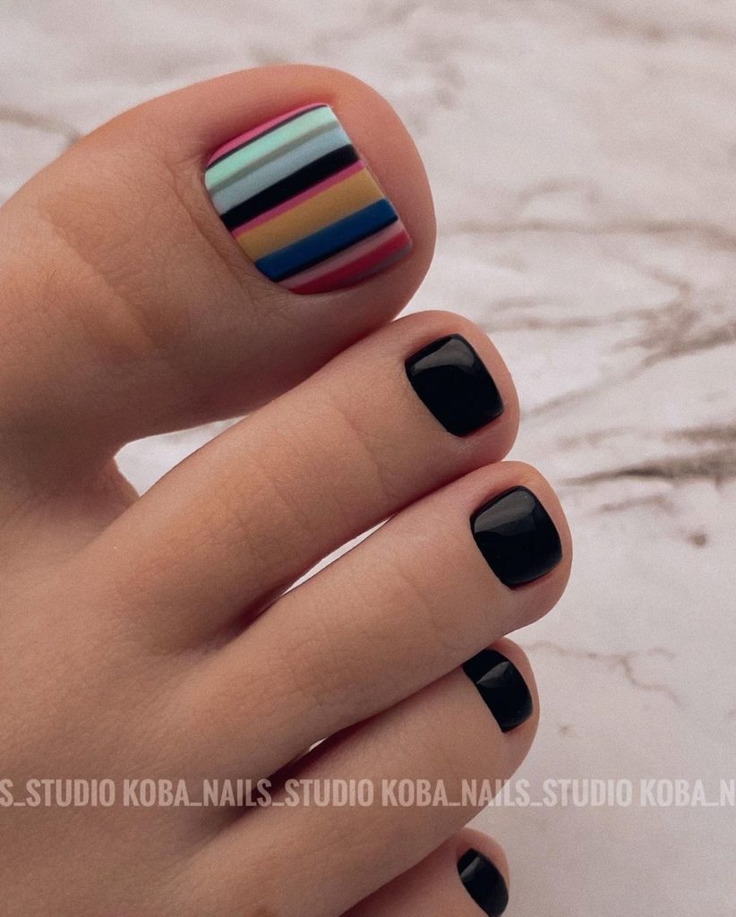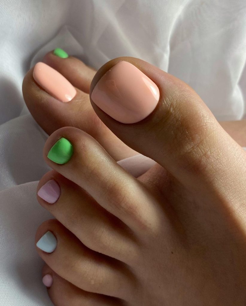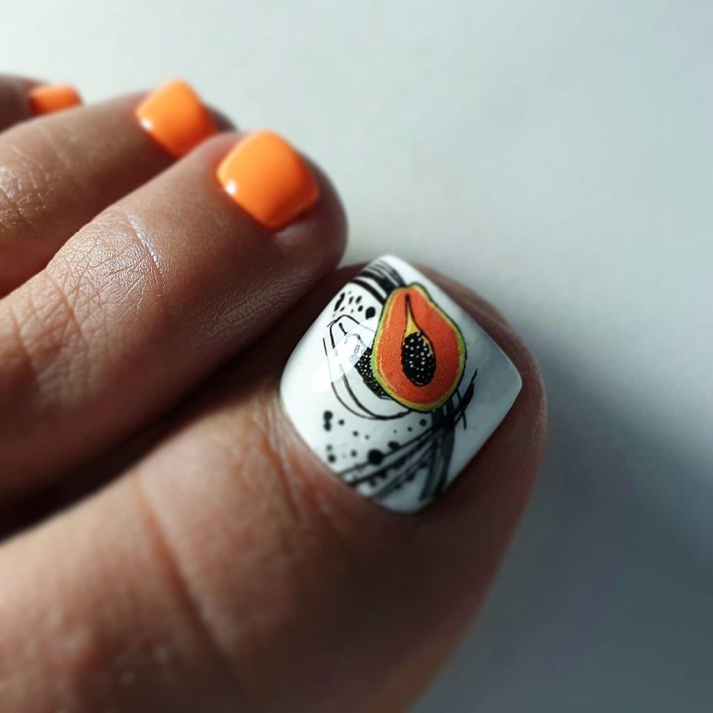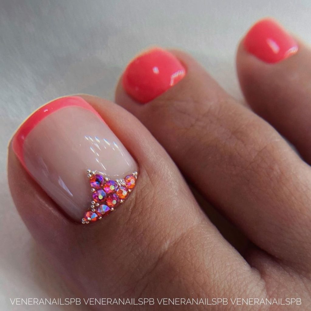 Красивим дизайн педикюру робить не тільки декор та прикраси, але і кольори. Зараз в моді як монохромний дизайн, так і покриття нігтів в різні відтінки. В основному іншим кольором виділяють ніготь на великому пальці. Він же і підлягає акцентному дизайну в будь-якому варіанті педикюру.