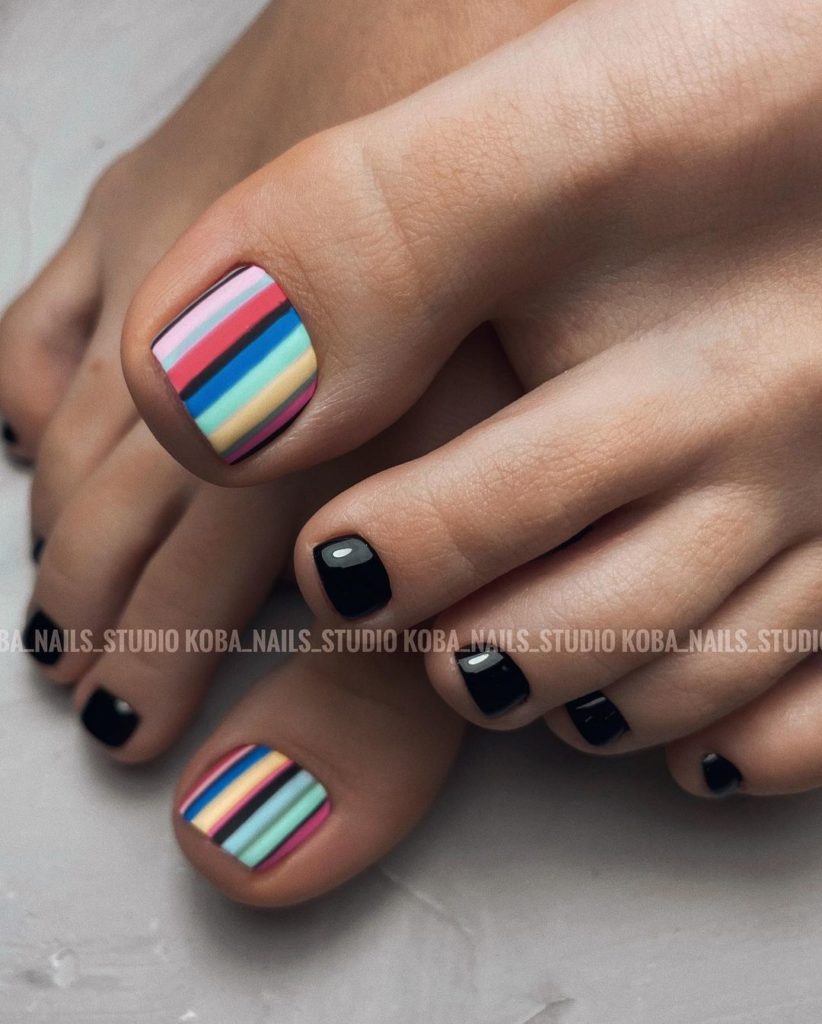 В моду знову повертаються смужки на нігтях. Тільки цього разу модний педикюр в смужку стане яскравішим і цікавішим. В тренді веселковий дизайн з різнокольоровими смужками. Оригінальним в цьому сезоні стане яскравий дизайн педикюру з смужками неправильної форми. Малюнок більше нагадує веселку, що робить педикюр більш незвичайним і красивим.