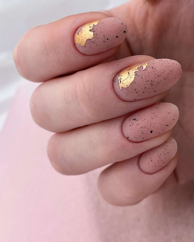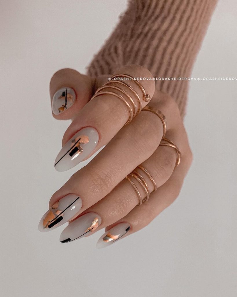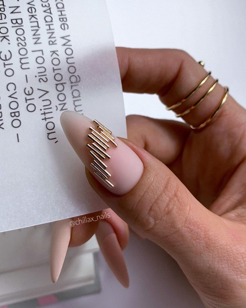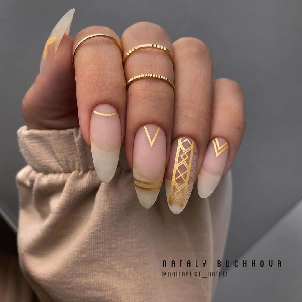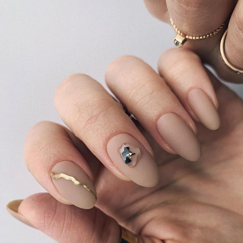 «Не все, що блищить це золото», хоча в нашому випадку якраз-таки навпаки. У модному манікюрі 2025 будь-які натяки на золото актуальні і надзвичайно популярні. Найбільш часто в дизайнах сучасного манікюру зустрічається золота поталь і фольга, які відмінно поєднуються з мінімалістичними малюнками і абстрактною павутинкою.