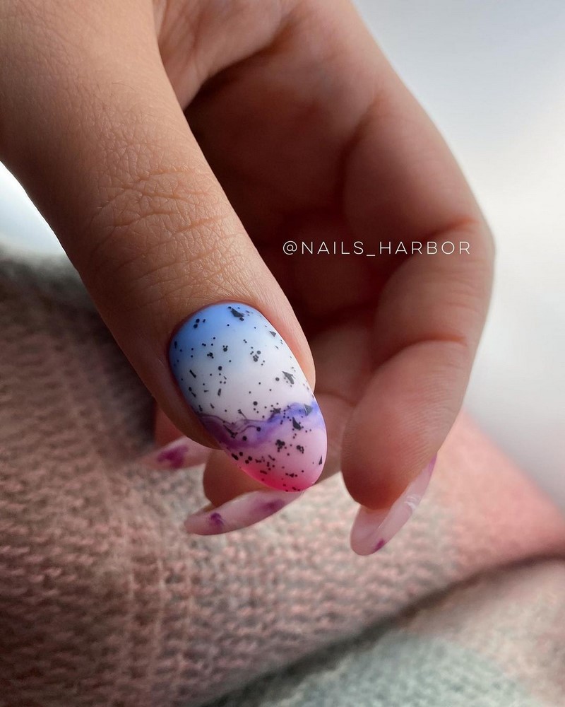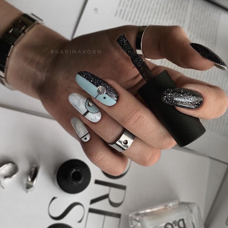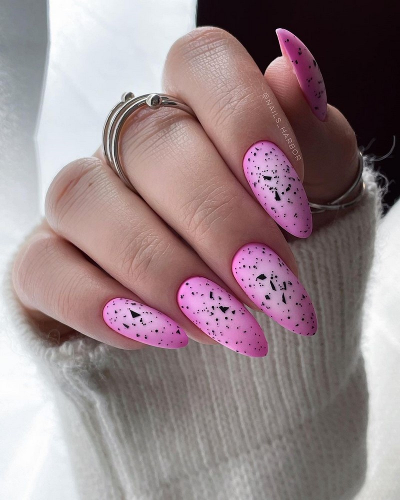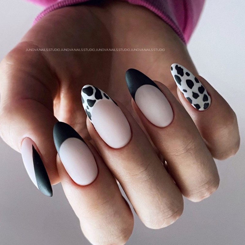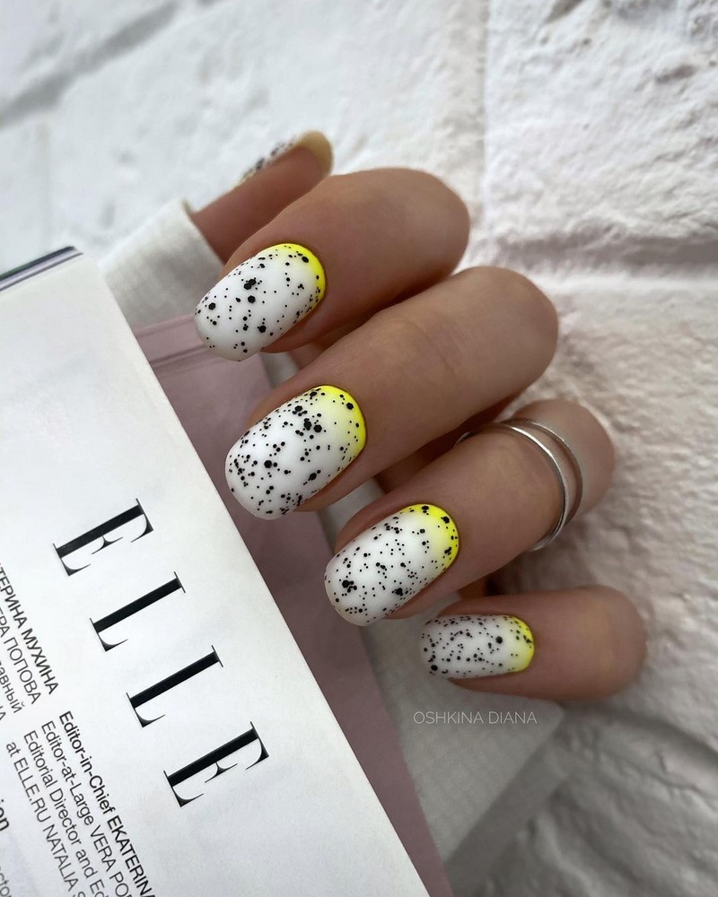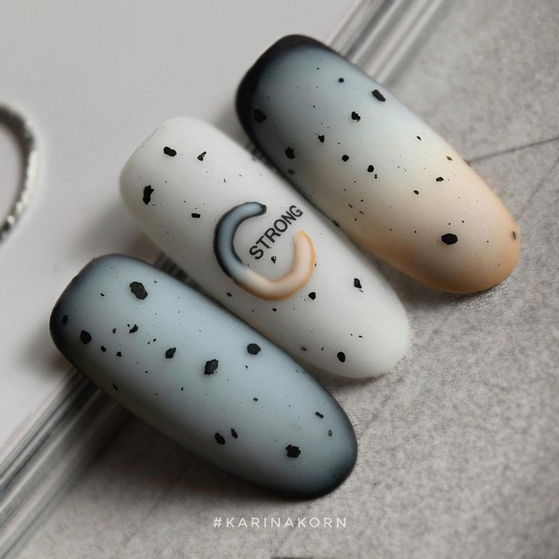 Як раніше майстри манікюру всюди тицяли блискітки, так сьогодні в багатьох дизайнах з’являється акцент у вигляді чорних крапок. Текстури, малюнки, монохром, градієнт навіть дуже непогано поєднується з чорними цятками, особливо в матових дизайнах. Як виглядає подібний манікюр на ділі, видно на фото прикладах.