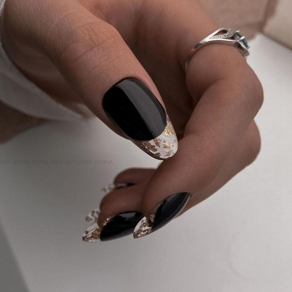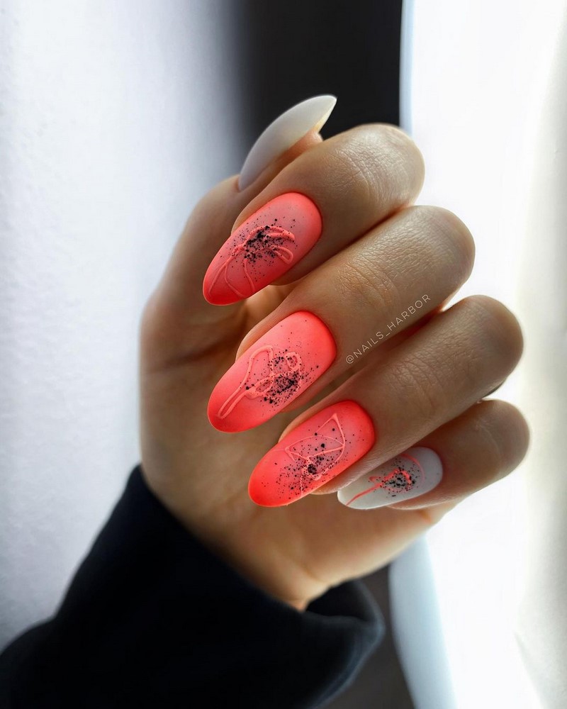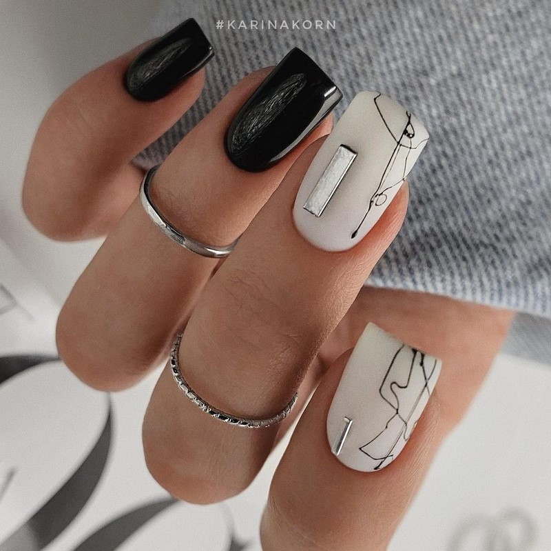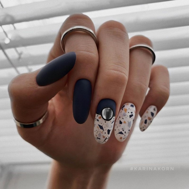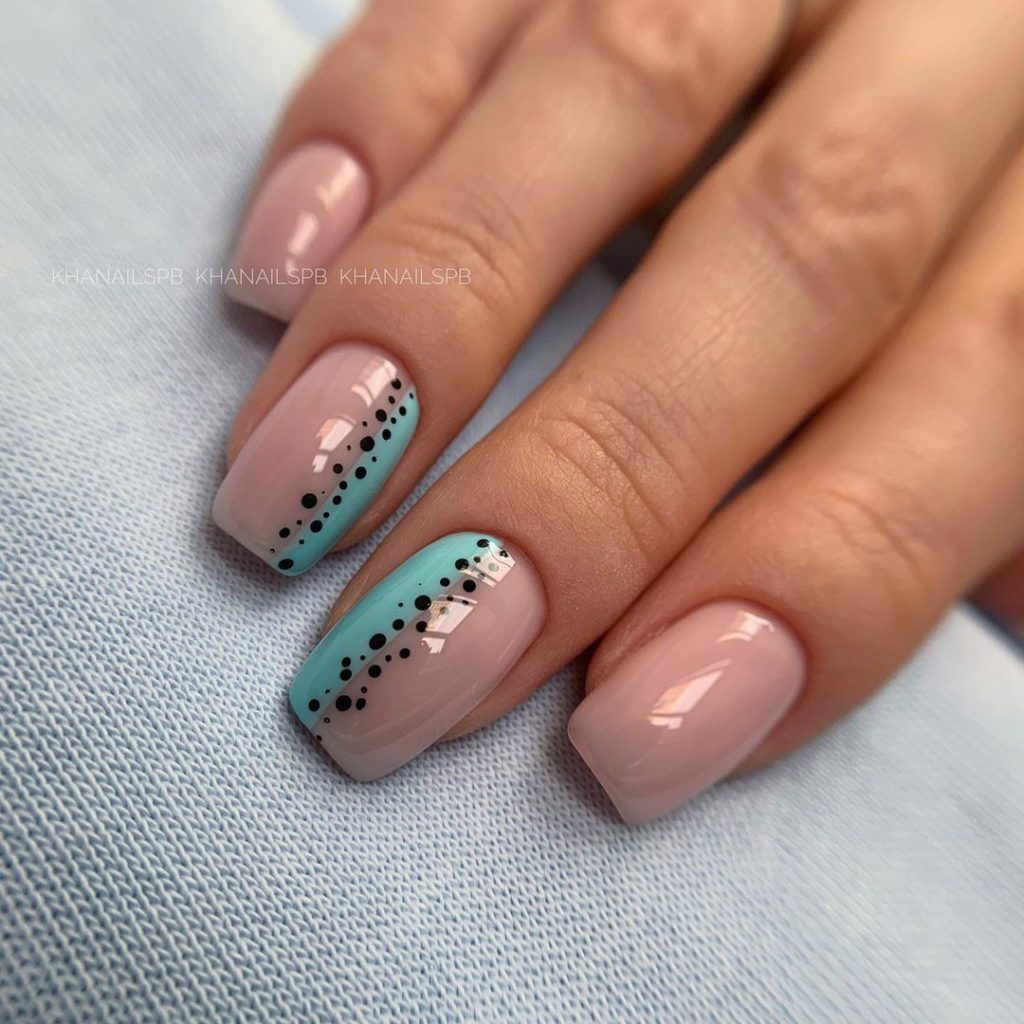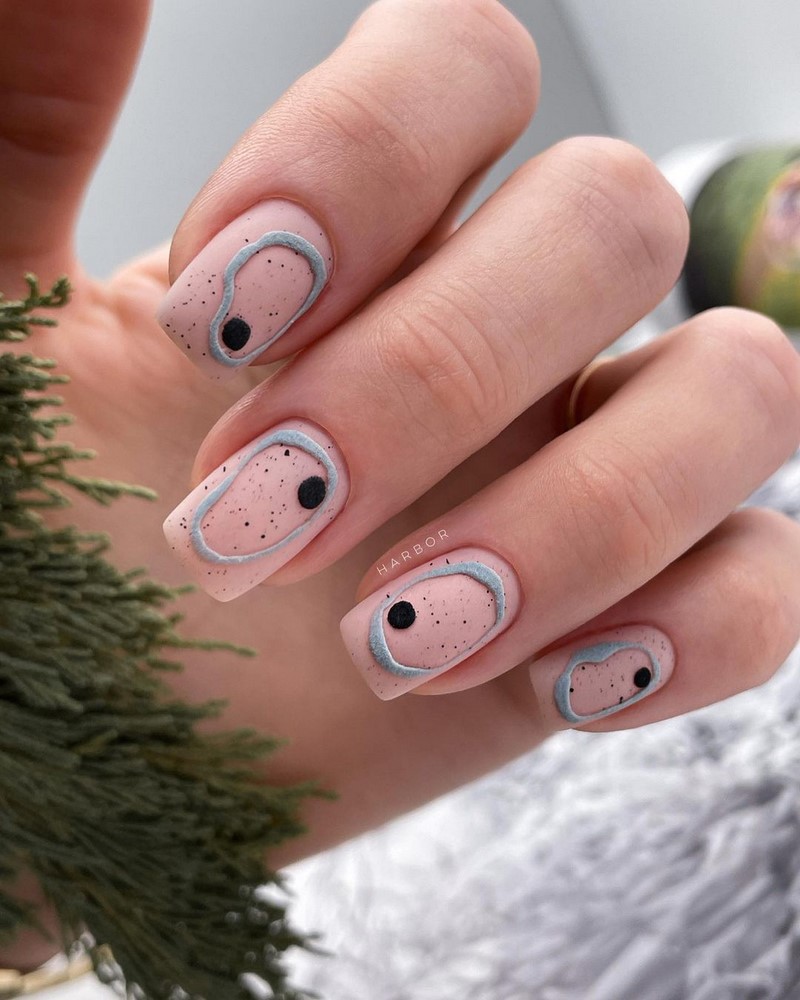 Як раніше майстри манікюру всюди тицяли блискітки, так сьогодні в багатьох дизайнах з’являється акцент у вигляді чорних крапок. Текстури, малюнки, монохром, градієнт навіть дуже непогано поєднується з чорними цятками, особливо в матових дизайнах. Як виглядає подібний манікюр на ділі, видно на фото прикладах.