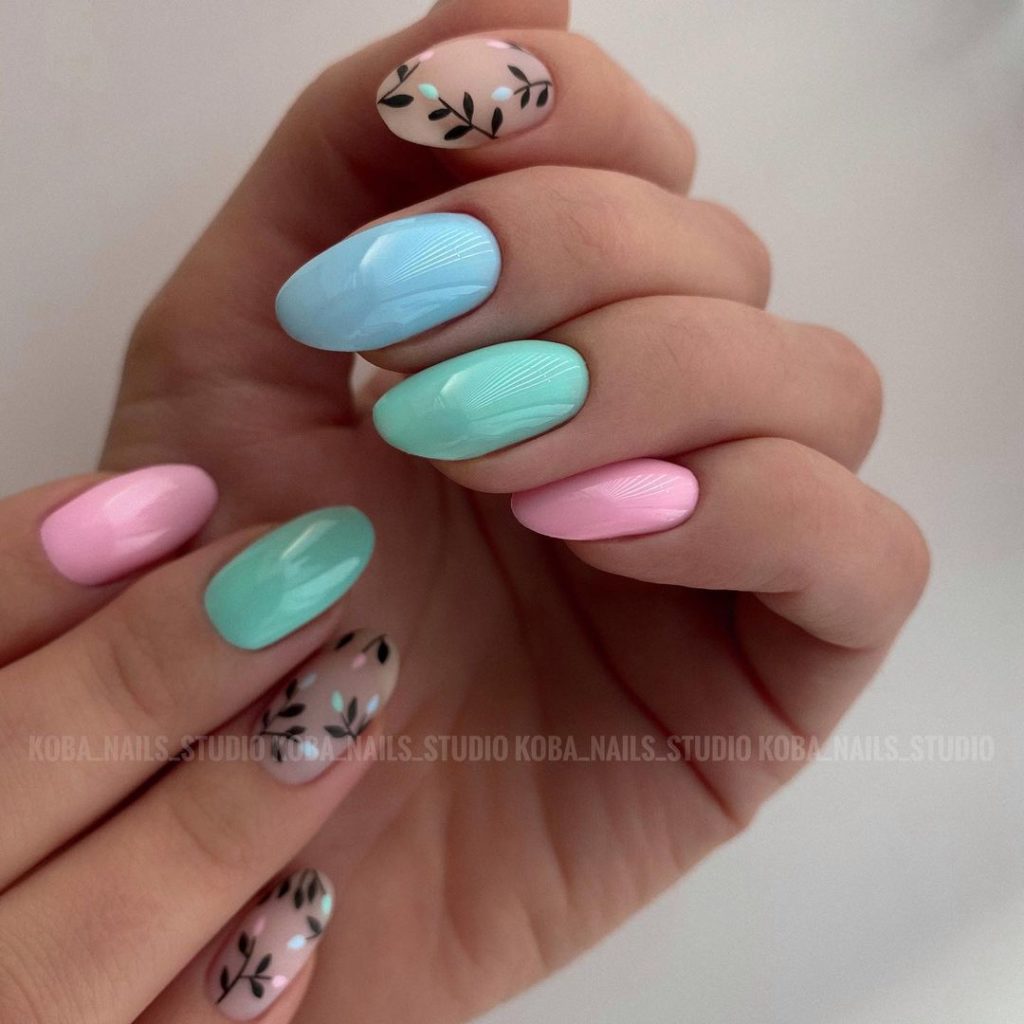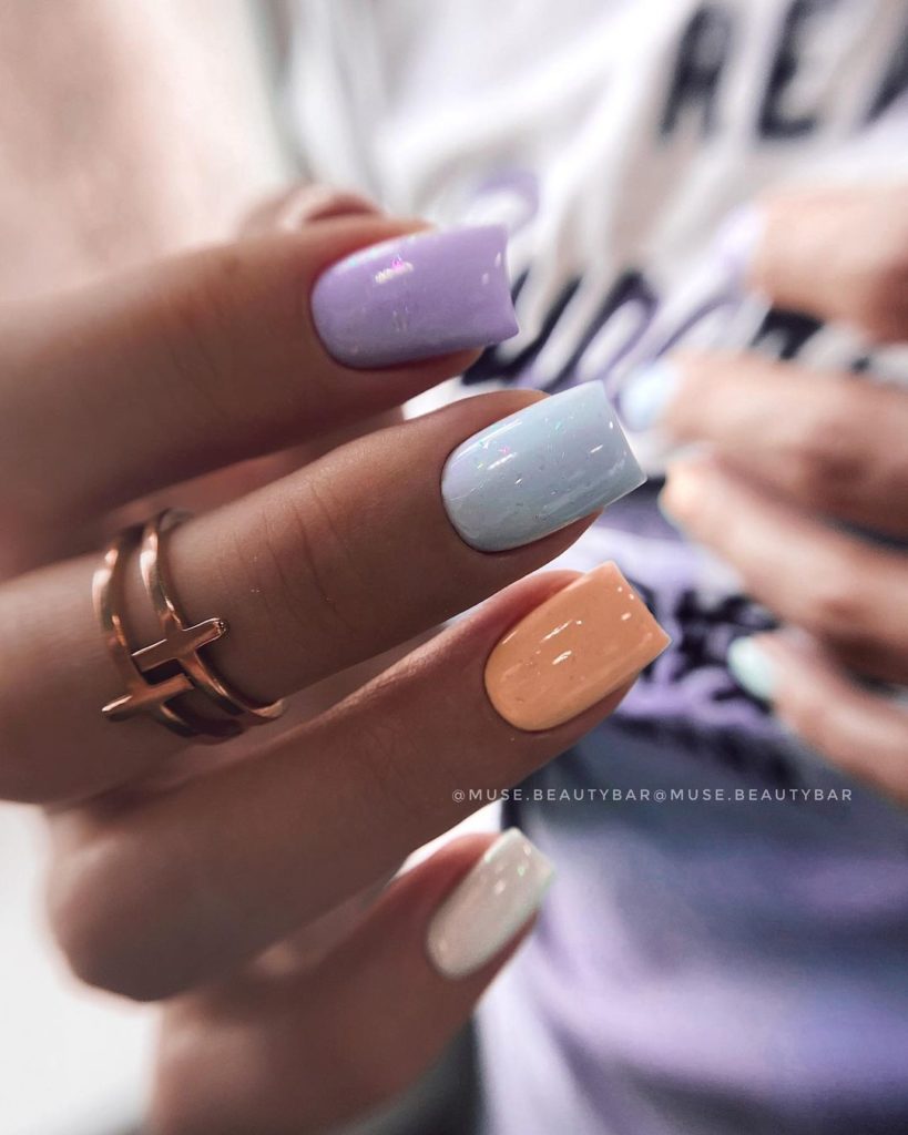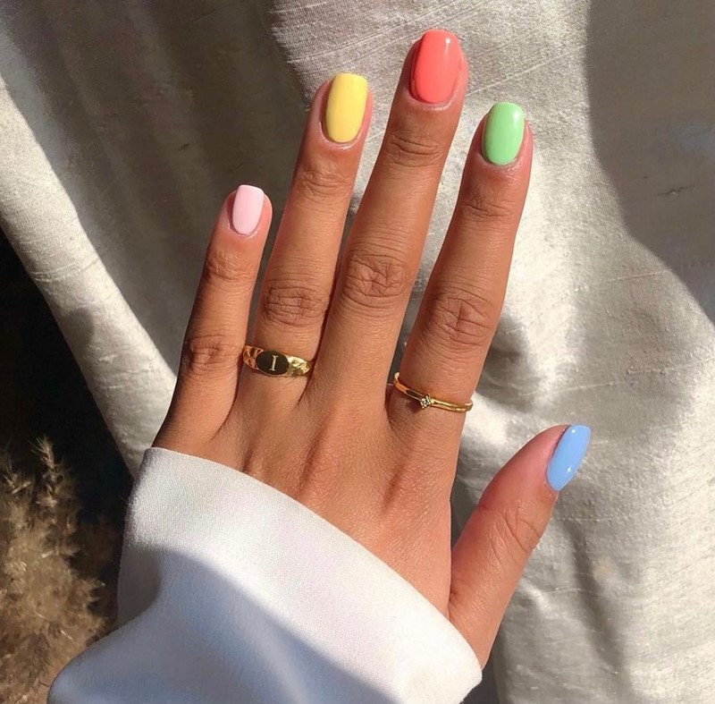 Веселка з пальців стане особливо популярною для тих, хто не може визначитися з модним кольором манікюру. Модні нігті, пофарбовані в різні відтінки, будуть актуальні не тільки в весняно-літньому сезоні 2025 року. Для осені або зими потрібно всього лише підібрати гаму спокійнішу, або використовувати безпрограшний варіант з матовим топом.