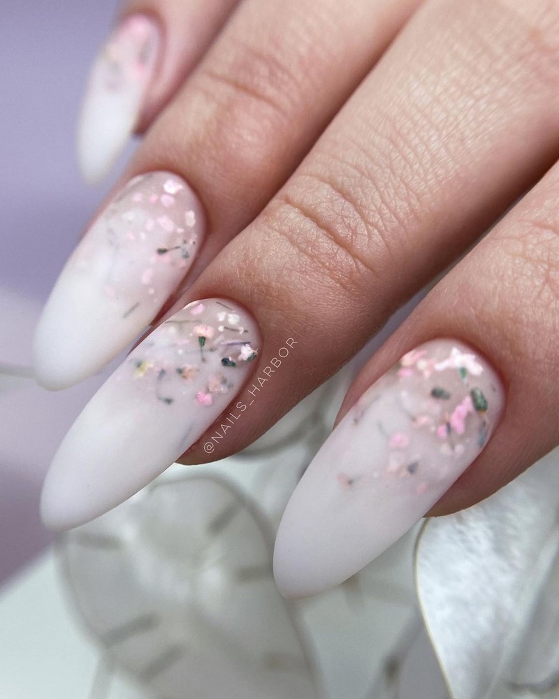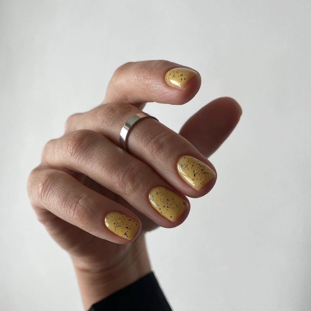 Гель-лаки та топи з вкрапленнями, які в дизайні будуть нагадувати відомий манікюр в стилі «перепелине яйце», замінять в новому сезоні 2025 році блискучі блискітки і гліттер.