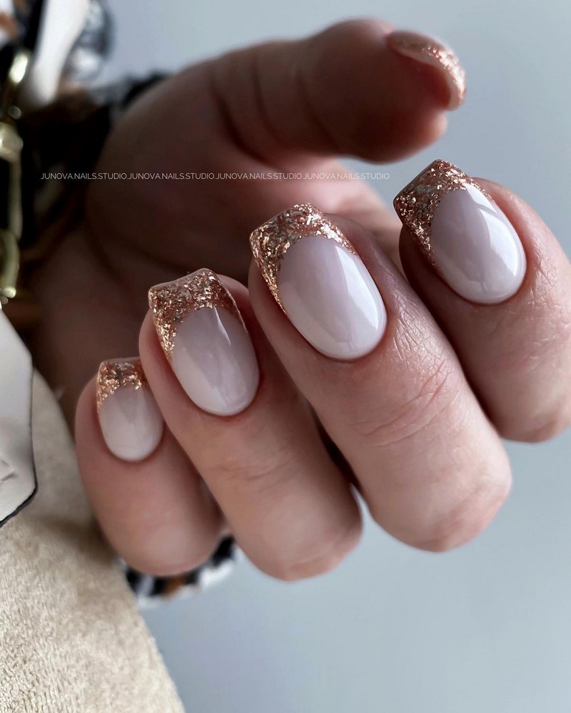 Далі за популярністю слід виділити модний дизайн з втиркой. Ось тільки в тренді будуть варіанти з частковим використанням золотистого пігменту. Втирка на всіх нігтях стає антитрендом манікюру 2025 року.