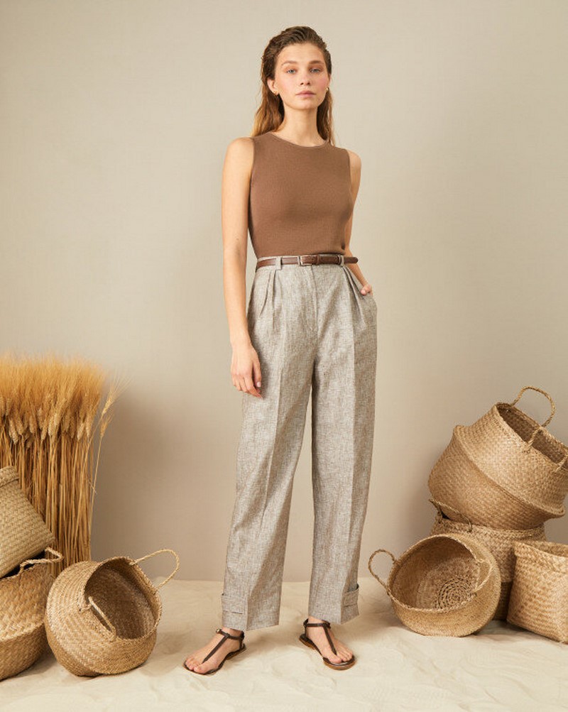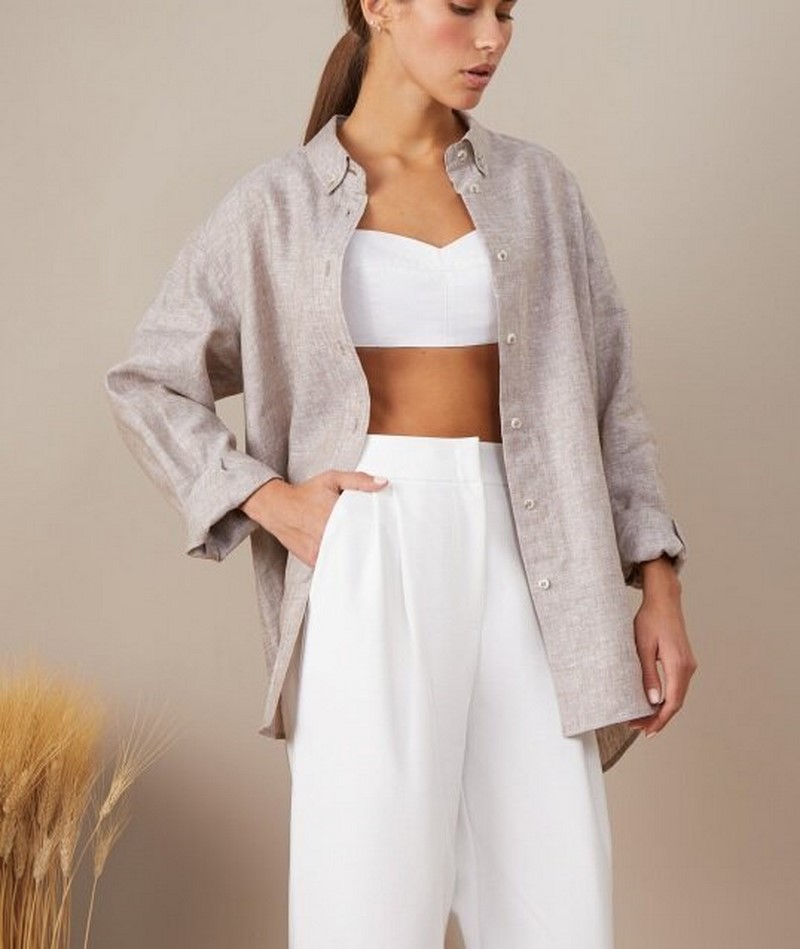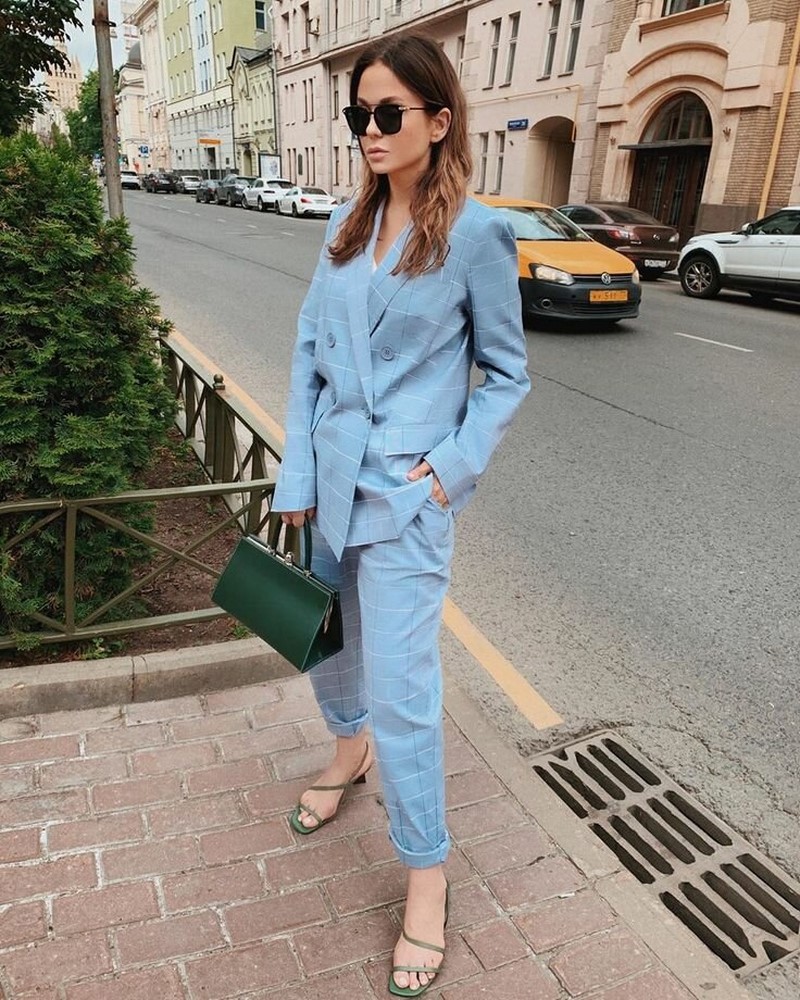| Джинси прямого крою середньої або високої посадки, можливо трохи укорочені (блакитні, сірі, чорні, беж, білі) , бежеві та інших нейтральних кольорів | Сорочки, джемпери в ніжну тоненьку смужку в дусі маскулінності | Костюми брючного крою з піджаком вільного або приталеного крою — пісочні, білі, сірі, бежеві та інших нейтральних квітів |