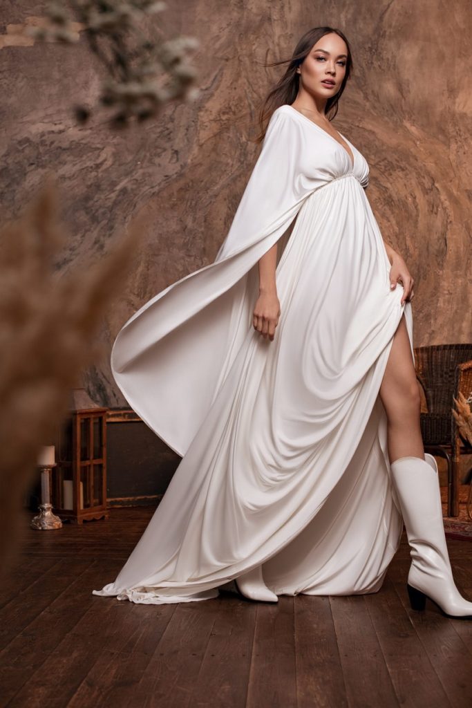 Ще один модний весільний тренд 2025, який гармонійно поєднується з цікавим станом нареченої, це легка весільна накидка в дизайні сукні. Вона може бути імітацією або ж бути знімною деталлю весільного вбрання для вагітних.