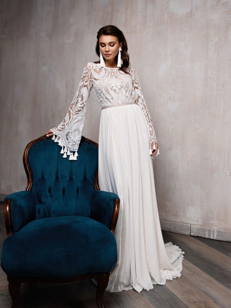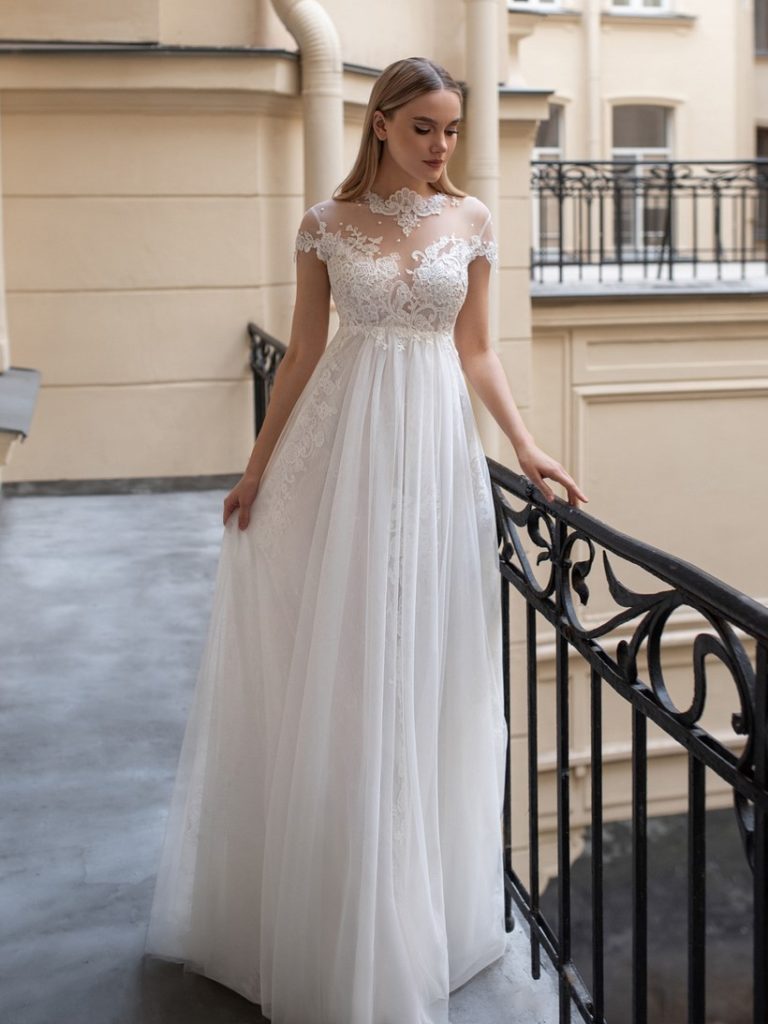 Багатий мереживний верх частіше поєднується з повітряним багатошаровим фатином. Але популярніше зараз варіант з ніжною вишивкою по всьому весільному вбранні з легким блискучим ефектом.