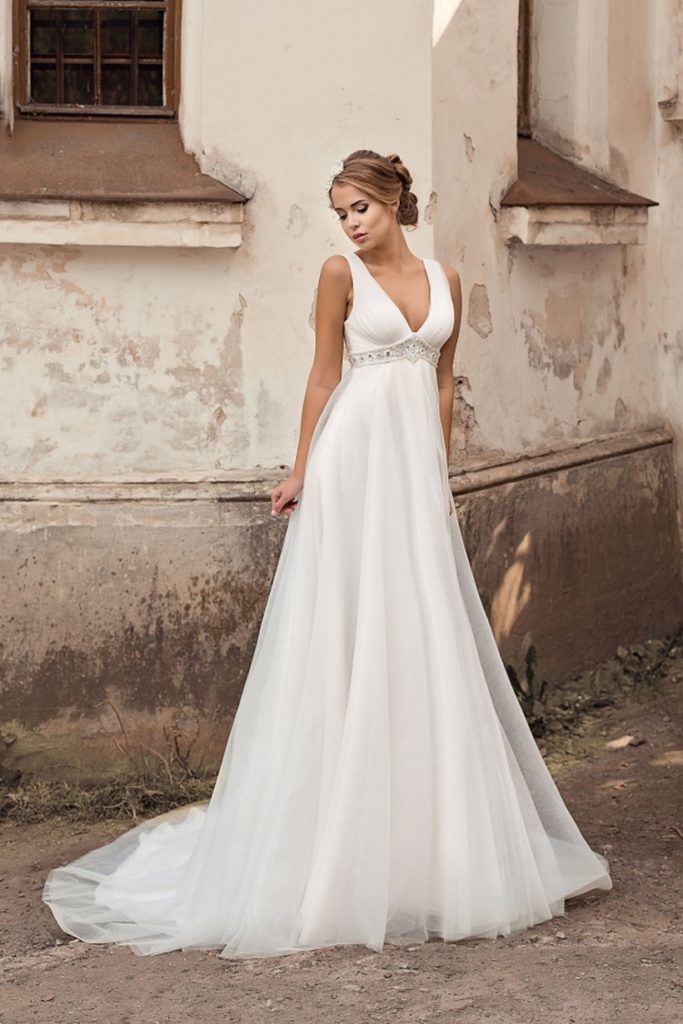 Традиційною моделлю сукні для вагітних залишається грецький стиль. Але і в ньому можна знайти оригінальні рішення. Верх весільної грецької сукні для вагітних не обов’язково повинен бути на запах. Оригінально виглядатимуть модельки на одне плече, сукні з мереживним ліфом чи сукні з коротким опущеним рукавом.