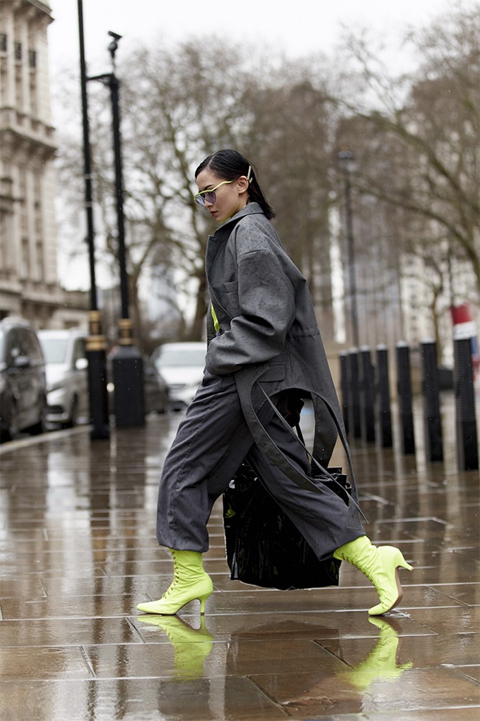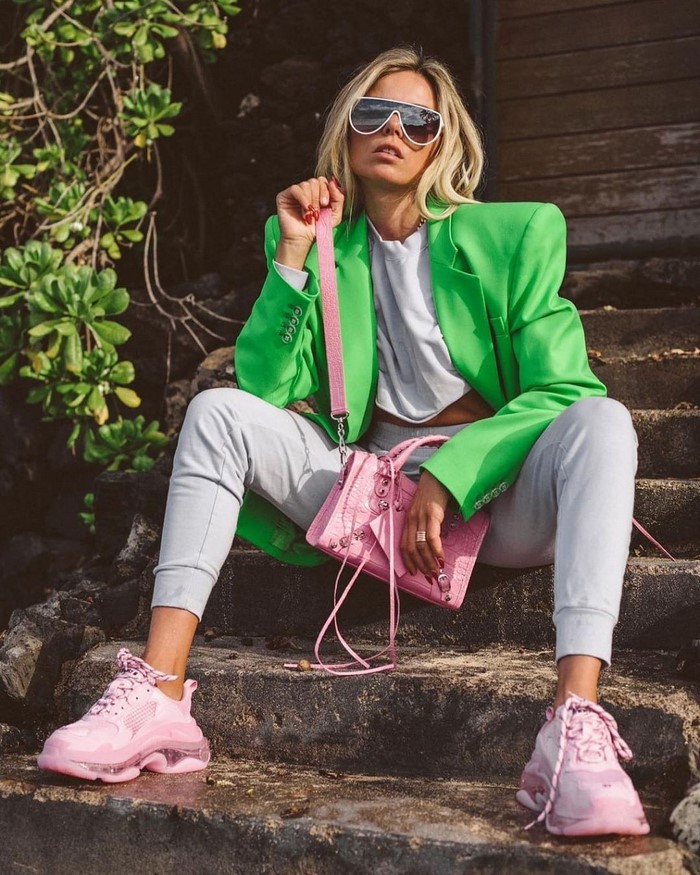 Що стосується взуття сезону весна-літо, складаємо вуличні образи з високими кросівками, кедами, грубими в’єтнамками/шльопанцями, сандалями, зеленими, помаранчевими, рожевими, жовтими босоніжками.